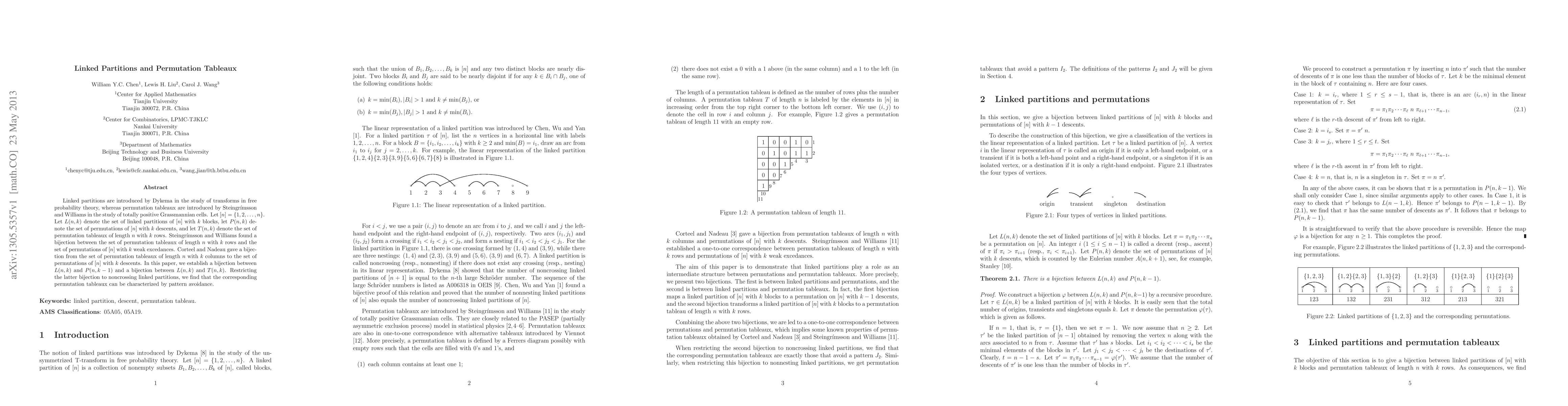 Linked partitions are introduced by Dykema in the study of transforms in free probability theory, whereas permutation tableaux are introduced by Steingr\'{i}msson and Williams in the study of totally positive Grassmannian cells. Let $[n]=\{1,2,\ldots,n\}$. Let $L(n,k)$ denote the set of linked partitions of $[n]$ with $k$ blocks, let $P(n,k)$ denote the set of permutations of $[n]$ with $k$ descents, and let $T(n,k)$ denote the set of permutation tableaux of length $n$ with $k$ rows. Steingr\'{i}msson and Williams found a bijection between the set of permutation tableaux of length $n$ with $k$ rows and the set of permutations of $[n]$ with $k$ weak excedances. Corteel and Nadeau gave a bijection from the set of permutation tableaux of length $n$ with $k$ columns to the set of permutations of $[n]$ with $k$ descents. In this paper, we establish a bijection between $L(n,k)$ and $P(n,k-1)$ and a bijection between $L(n,k)$ and $T(n,k)$. Restricting the latter bijection to noncrossing linked partitions, we find that the corresponding permutation tableaux can be characterized by pattern avoidance.