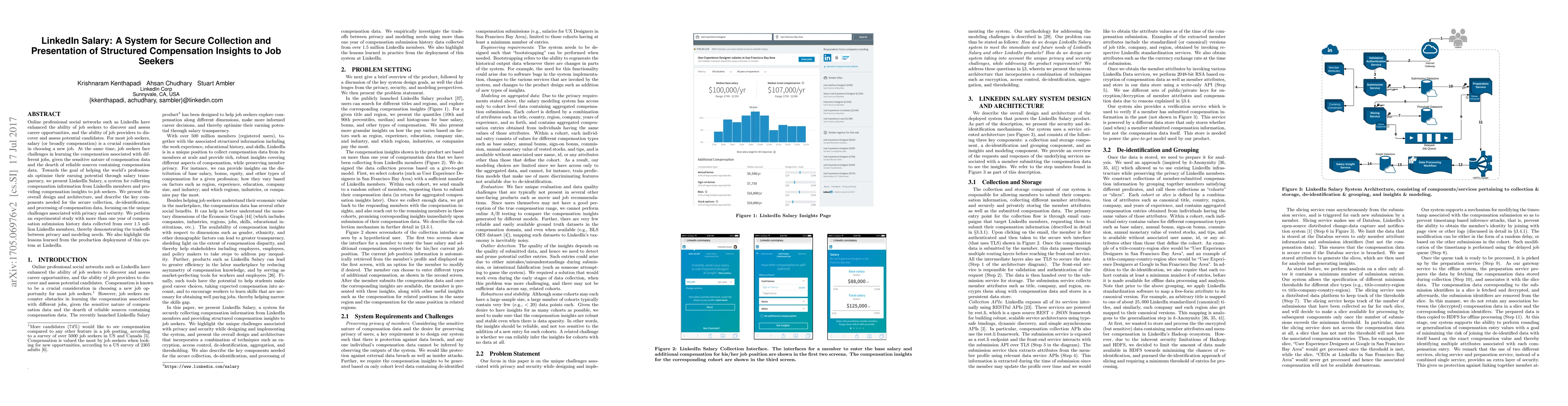 LinkedIn Salary is a system designed to securely collect and present structured compensation insights to job seekers, addressing privacy and security challenges in handling sensitive compensation data. The system was deployed at LinkedIn, and an experimental study demonstrated the balance between privacy and data utility using over a year's worth of data from 1.5 million members.