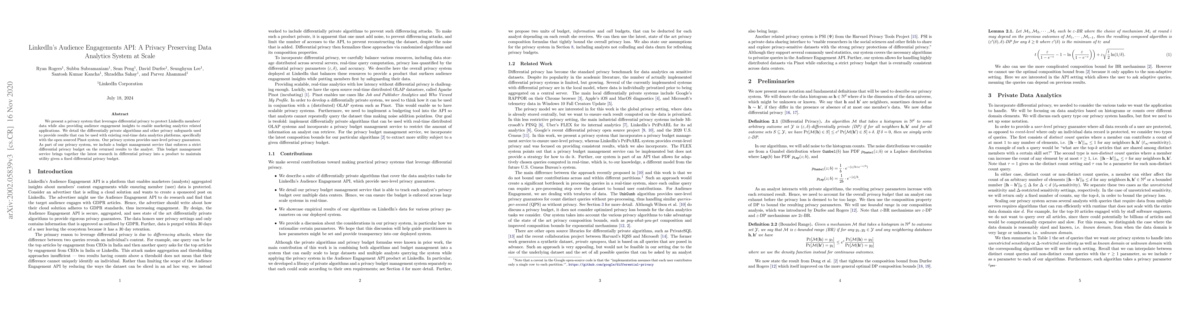 This paper introduces a privacy-preserving data analytics system for LinkedIn that uses differential privacy to safeguard user data while offering marketing insights. It details algorithms and safeguards to ensure user-level privacy, integrating with the open-source Pinot platform, and includes a budget management service to enforce differential privacy constraints.