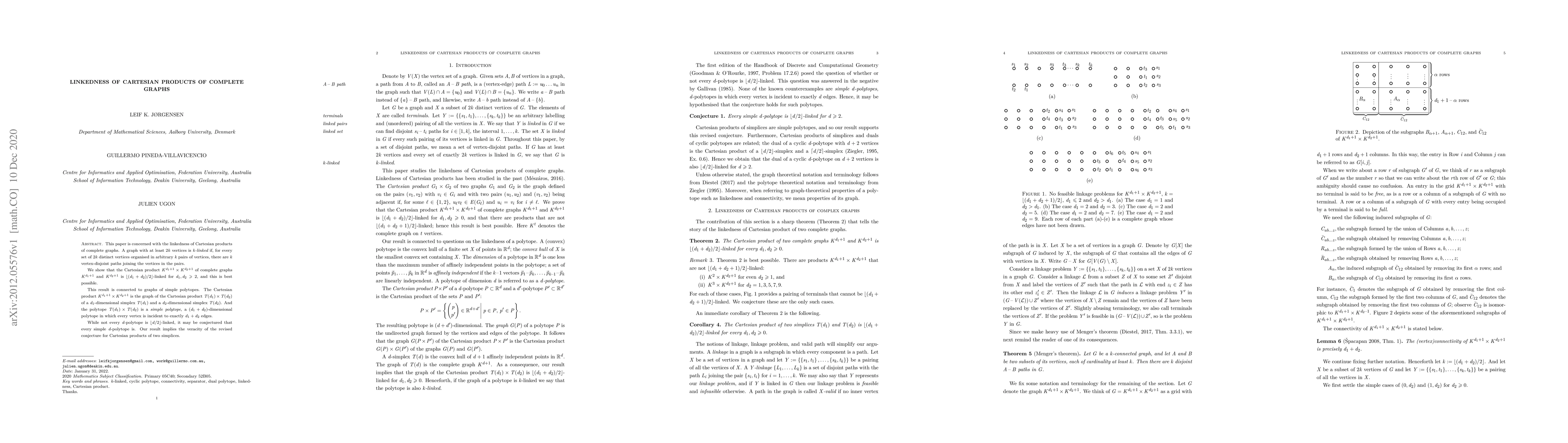This paper is concerned with the linkedness of Cartesian products of complete graphs. A graph with at least $2k$ vertices is {\it $k$-linked} if, for every set of $2k$ distinct vertices organised in arbitrary $k$ pairs of vertices, there are $k$ vertex-disjoint paths joining the vertices in the pairs. We show that the Cartesian product $K^{d_{1}+1}\times K^{d_{2}+1}$ of complete graphs $K^{d_{1}+1}$ and $K^{d_{2}+1}$ is $\floor{(d_{1}+d_{2})/2}$-linked for $d_{1},d_{2}\ge 2$, and this is best possible. %A polytope is said to be {\it $k$-linked} if its graph is $k$-linked. This result is connected to graphs of simple polytopes. The Cartesian product $K^{d_{1}+1}\times K^{d_{2}+1}$ is the graph of the Cartesian product $T(d_{1})\times T(d_{2})$ of a $d_{1}$-dimensional simplex $T(d_{1})$ and a $d_{2}$-dimensional simplex $T(d_{2})$. And the polytope $T(d_{1})\times T(d_{2})$ is a {\it simple polytope}, a $(d_{1}+d_{2})$-dimensional polytope in which every vertex is incident to exactly $d_{1}+d_{2}$ edges. While not every $d$-polytope is $\floor{d/2}$-linked, it may be conjectured that every simple $d$-polytope is. Our result implies the veracity of the revised conjecture for Cartesian products of two simplices.
