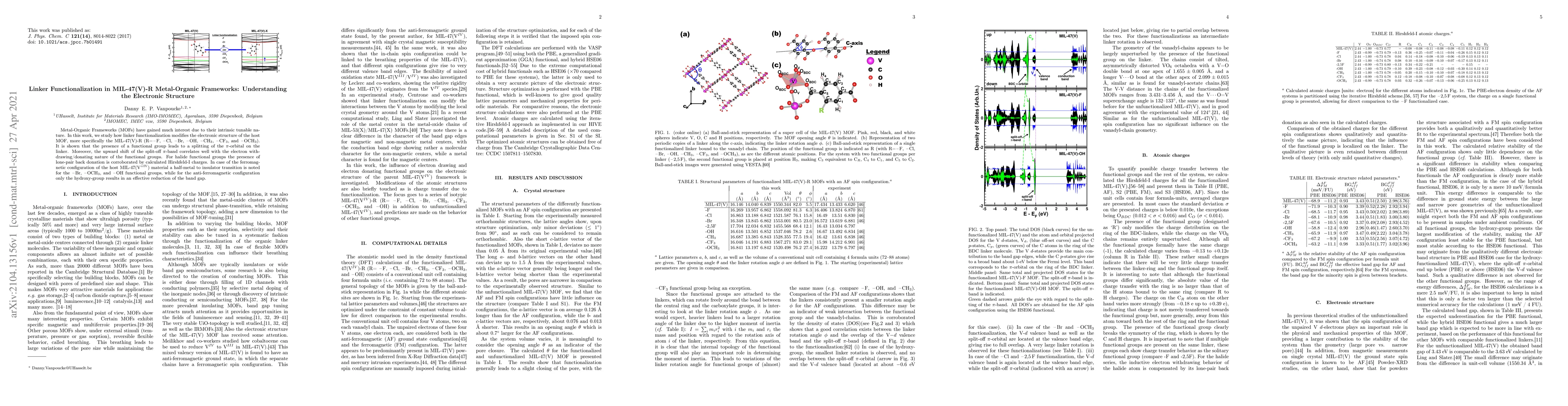 Metal-Organic Frameworks (MOFs) have gained much interest due to their intrinsic tunable nature. In this work, we study how linker functionalization modifies the electronic structure of the host MOF, more specifically the MIL-47(V)-R (R=-F, -Cl, -Br, -OH, -CH$_3$, -CF$_3$, and -OCH$_3$). It is shown that the presence of a functional group leads to a splitting of the $\pi$-orbital on the linker. Moreover, the upward shift of the split-off $\pi$-band correlates well with the electron withdrawing/donating nature of the functional groups. For halide functional groups the presence of lone-pair back donation is corroborated by calculated Hirshfeld-I charges. In case of the ferromagnetic configuration of the host MIL-47(V$^{\mathrm{+IV}}$) material a half-metal to insulator transition is noted for the -Br, -OCH$_3$, and -OH functional groups, while for the anti-ferromagnetic configuration only the hydroxy-group results in an effective reduction of the band gap.