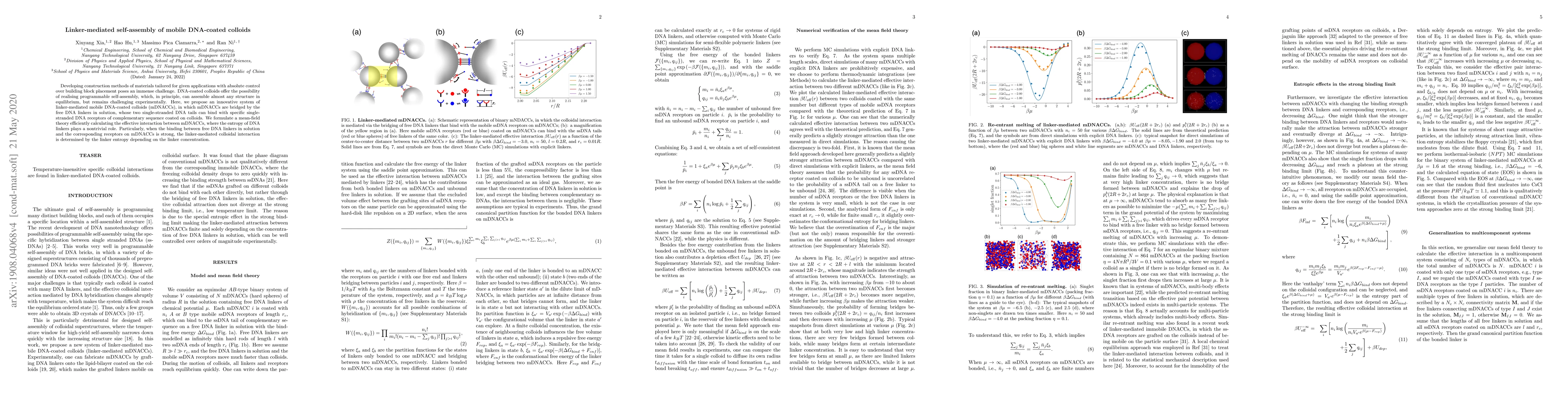 This paper proposes a system of linker-mediated mobile DNA-coated colloids (mDNACCs) that self-assemble through specific DNA binding interactions. The study formulates a mean-field theory to calculate effective interactions between mDNACCs, highlighting the role of linker entropy in determining colloidal interactions.