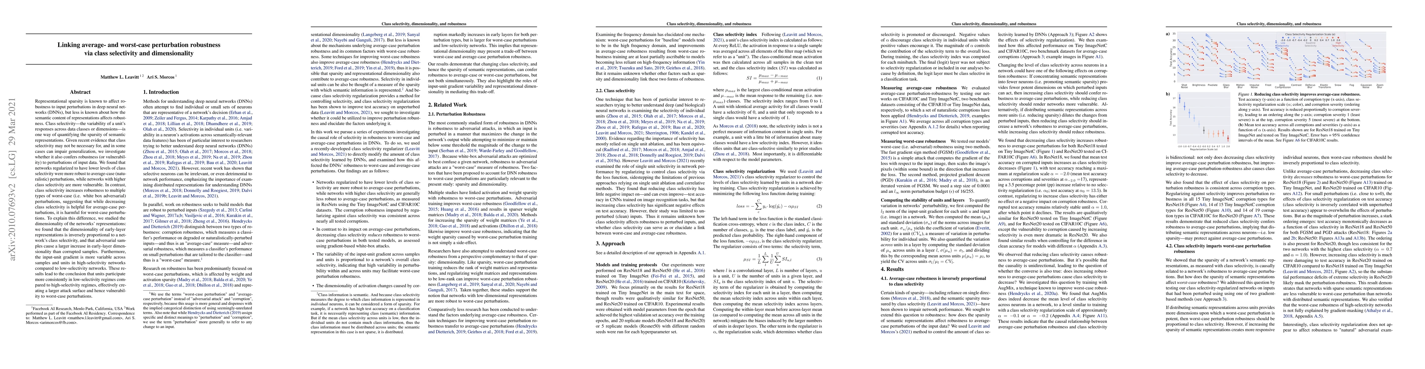 Representational sparsity is known to affect robustness to input perturbations in deep neural networks (DNNs), but less is known about how the semantic content of representations affects robustness. Class selectivity-the variability of a unit's responses across data classes or dimensions-is one way of quantifying the sparsity of semantic representations. Given recent evidence that class selectivity may not be necessary for, and in some cases can impair generalization, we investigate whether it also confers robustness (or vulnerability) to perturbations of input data. We found that networks regularized to have lower levels of class selectivity were more robust to average-case (naturalistic) perturbations, while networks with higher class selectivity are more vulnerable. In contrast, class selectivity increases robustness to multiple types of worst-case (i.e. white box adversarial) perturbations, suggesting that while decreasing class selectivity is helpful for average-case perturbations, it is harmful for worst-case perturbations. To explain this difference, we studied the dimensionality of the networks' representations: we found that the dimensionality of early-layer representations is inversely proportional to a network's class selectivity, and that adversarial samples cause a larger increase in early-layer dimensionality than corrupted samples. Furthermore, the input-unit gradient is more variable across samples and units in high-selectivity networks compared to low-selectivity networks. These results lead to the conclusion that units participate more consistently in low-selectivity regimes compared to high-selectivity regimes, effectively creating a larger attack surface and hence vulnerability to worst-case perturbations.