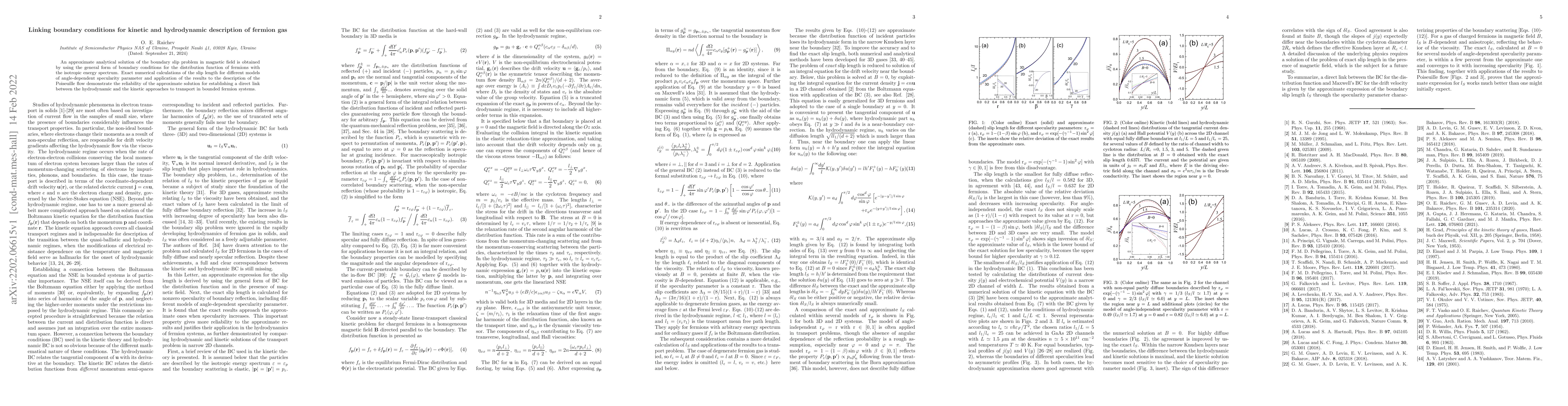 An approximate analytical solution of the boundary slip problem in magnetic field is obtained by using the general form of boundary conditions for the distribution function of fermions with the isotropic energy spectrum. Exact numerical calculations of the slip length for different models of angle-dependent specularity parameter and application of the results to the description of the Poiseuille flow demonstrate the reliability of the approximate solution for establishing a direct link between the hydrodynamic and the kinetic approaches to transport in bounded fermion systems.