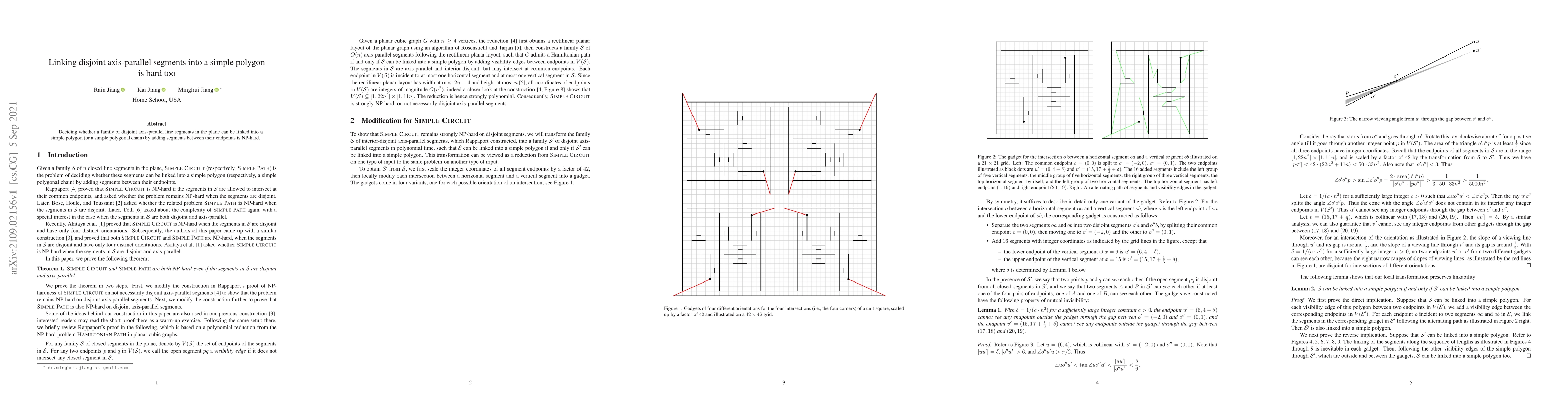 The paper demonstrates the NP-hardness of deciding whether a family of disjoint axis-parallel line segments in the plane can be linked into a simple polygon by adding segments between their endpoints.