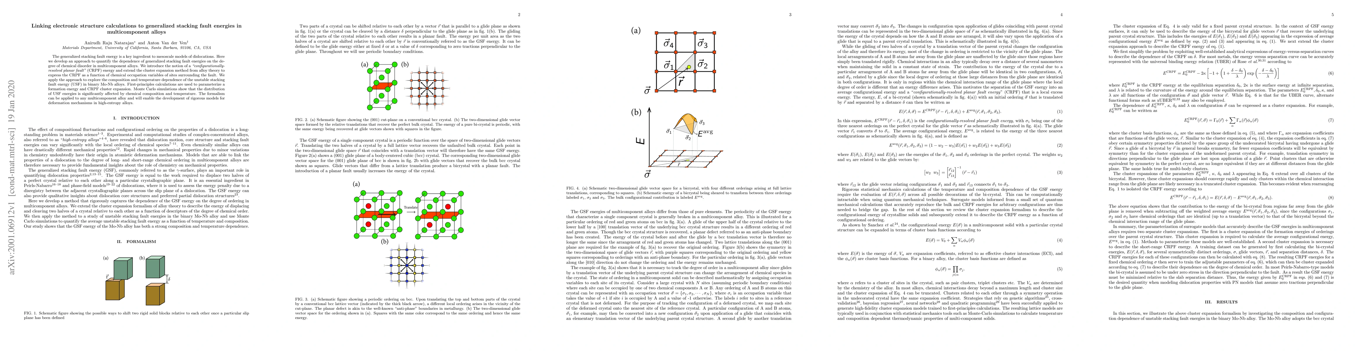 The generalized stacking fault energy is a key ingredient to mesoscale models of dislocations. Here we develop an approach to quantify the dependence of generalized stacking fault energies on the degree of chemical disorder in multicomponent alloys. We introduce the notion of a "configurationally-resolved planar fault" (CRPF) energy and extend the cluster expansion method from alloy theory to express the CRPF as a function of chemical occupation variables of sites surrounding the fault. We apply the approach to explore the composition and temperature dependence of the unstable stacking fault energy (USF) in binary Mo-Nb alloys. First-principles calculations are used to parameterize a formation energy and CRPF cluster expansion. Monte Carlo simulations show that the distribution of USF energies is significantly affected by chemical composition and temperature. The formalism can be applied to any multicomponent alloy and will enable the development of rigorous models for deformation mechanisms in high-entropy alloys.