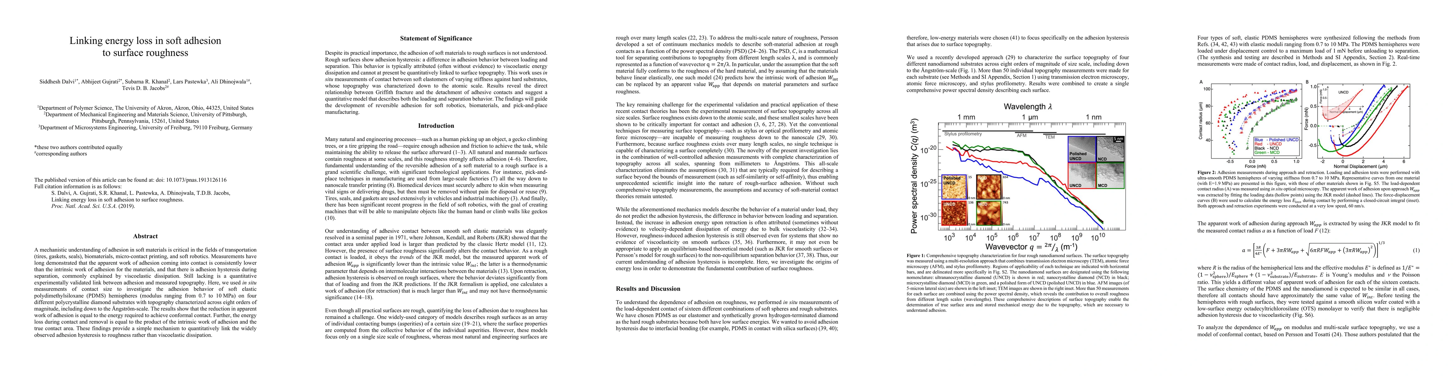 This study investigates the relationship between adhesion hysteresis in soft materials and surface roughness, demonstrating that energy loss during adhesion is directly proportional to the intrinsic work of adhesion and the true contact area, rather than viscoelastic dissipation. The findings provide a quantitative link between adhesion behavior and surface topography.