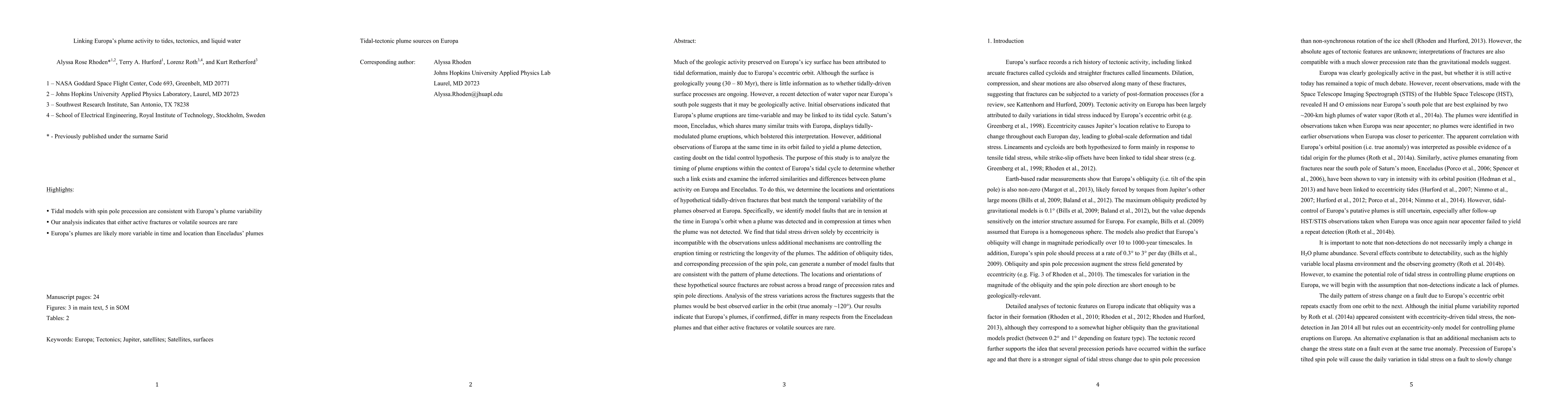This study investigates the potential link between Europa's plume activity and its tidal cycle, comparing it to Enceladus's tidally-modulated eruptions, while exploring the ongoing geological activity suggested by recent water vapor detections. The findings aim to clarify whether Europa's plumes are indeed driven by tidal forces.