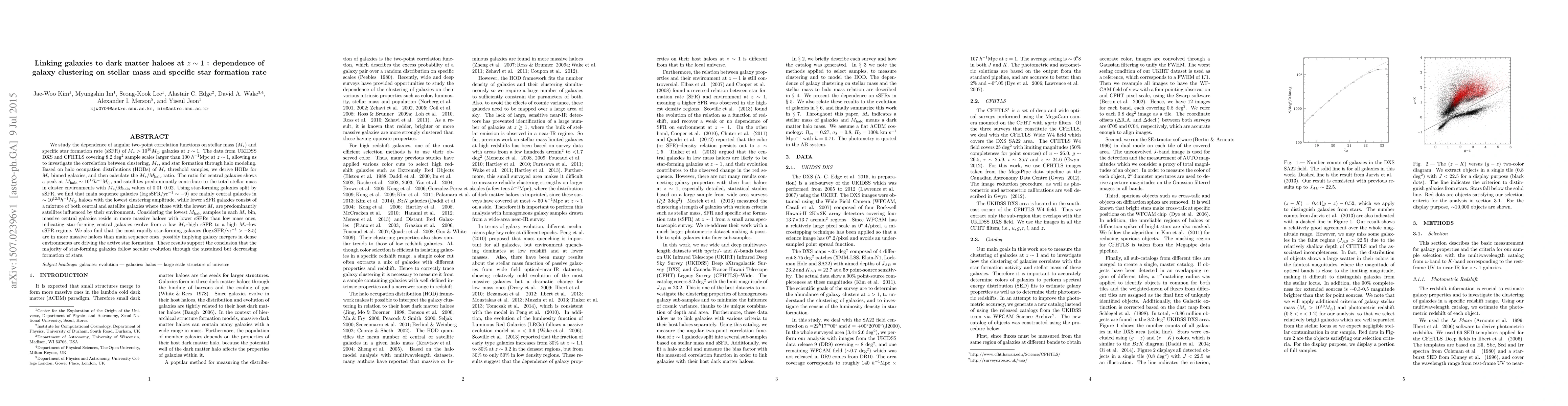We study the dependence of angular two-point correlation functions on stellar mass ($M_{*}$) and specific star formation rate (sSFR) of $M_{*}>10^{10}M_{\odot}$ galaxies at $z\sim1$. The data from UKIDSS DXS and CFHTLS covering 8.2 deg$^{2}$ sample scales larger than 100 $h^{-1}$Mpc at $z\sim1$, allowing us to investigate the correlation between clustering, $M_{*}$, and star formation through halo modeling. Based on halo occupation distributions (HODs) of $M_{*}$ threshold samples, we derive HODs for $M_{*}$ binned galaxies, and then calculate the $M_{*}/M_{\rm halo}$ ratio. The ratio for central galaxies shows a peak at $M_{\rm halo}\sim10^{12}h^{-1}M_{\odot}$, and satellites predominantly contribute to the total stellar mass in cluster environments with $M_{*}/M_{\rm halo}$ values of 0.01--0.02. Using star-forming galaxies split by sSFR, we find that main sequence galaxies ($\rm log\,sSFR/yr^{-1}\sim-9$) are mainly central galaxies in $\sim10^{12.5} h^{-1}M_{\odot}$ haloes with the lowest clustering amplitude, while lower sSFR galaxies consist of a mixture of both central and satellite galaxies where those with the lowest $M_{*}$ are predominantly satellites influenced by their environment. Considering the lowest $M_{\rm halo}$ samples in each $M_{*}$ bin, massive central galaxies reside in more massive haloes with lower sSFRs than low mass ones, indicating star-forming central galaxies evolve from a low $M_{*}$--high sSFR to a high $M_{*}$--low sSFR regime. We also find that the most rapidly star-forming galaxies ($\rm log\,sSFR/yr^{-1}>-8.5$) are in more massive haloes than main sequence ones, possibly implying galaxy mergers in dense environments are driving the active star formation. These results support the conclusion that the majority of star-forming galaxies follow secular evolution through the sustained but decreasing formation of stars.