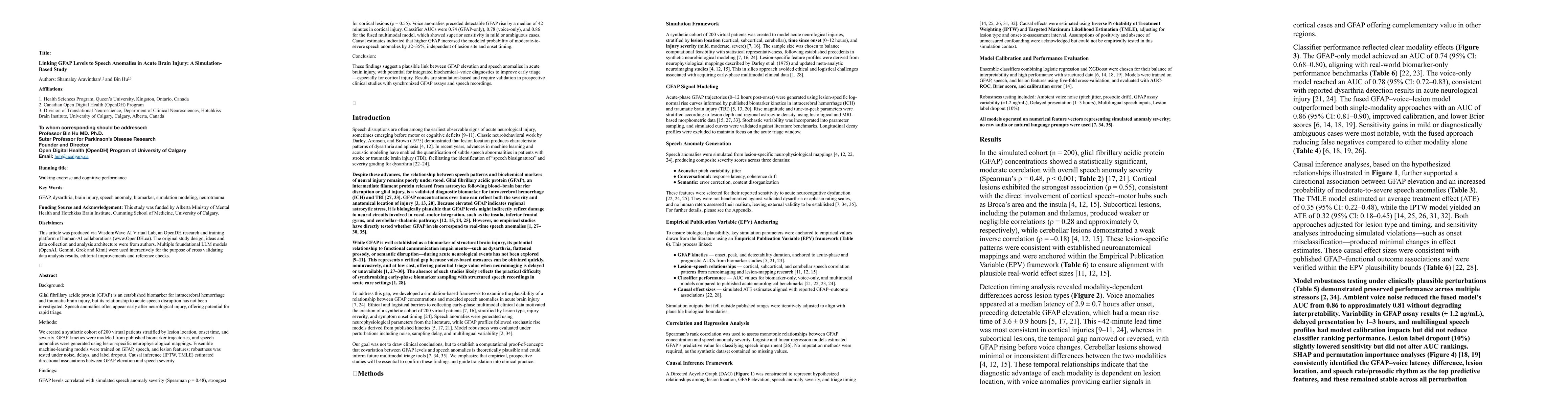 Background: Glial fibrillary acidic protein (GFAP) is a biomarker for intracerebral hemorrhage and traumatic brain injury, but its link to acute speech disruption is untested. Speech anomalies often emerge early after injury, enabling rapid triage. Methods: We simulated a cohort of 200 virtual patients stratified by lesion location, onset time, and severity. GFAP kinetics followed published trajectories; speech anomalies were generated from lesion-specific neurophysiological mappings. Ensemble machine-learning models used GFAP, speech, and lesion features; robustness was tested under noise, delays, and label dropout. Causal inference (inverse probability of treatment weighting and targeted maximum likelihood estimation) estimated directional associations between GFAP elevation and speech severity. Findings: GFAP correlated with simulated speech anomaly severity (Spearman rho = 0.48), strongest for cortical lesions (rho = 0.55). Voice anomalies preceded detectable GFAP rise by a median of 42 minutes in cortical injury. Classifier area under the curve values were 0.74 (GFAP only), 0.78 (voice only), and 0.86 for the fused multimodal model, which showed higher sensitivity in mild or ambiguous cases. Causal estimates indicated higher GFAP increased the modeled probability of moderate-to-severe speech anomalies by 32 to 35 percent, independent of lesion site and onset time. Conclusion: These results support a link between GFAP elevation and speech anomalies in acute brain injury and suggest integrated biochemical-voice diagnostics could improve early triage, especially for cortical injury. Findings are simulation-based and require validation in prospective clinical studies with synchronized GFAP assays and speech recordings.