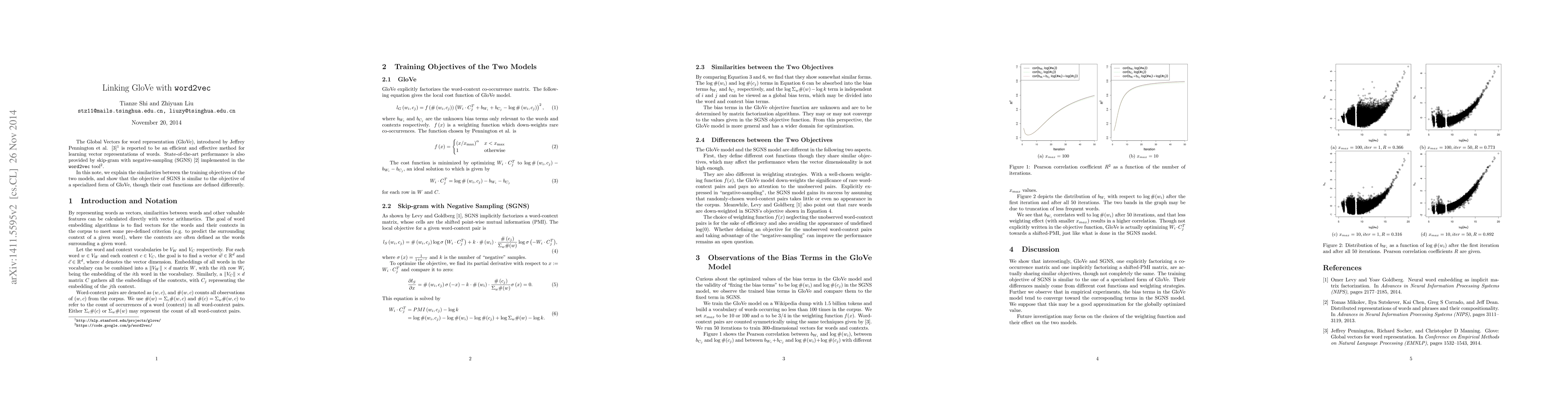 The Global Vectors for word representation (GloVe), introduced by Jeffrey Pennington et al. is reported to be an efficient and effective method for learning vector representations of words. State-of-the-art performance is also provided by skip-gram with negative-sampling (SGNS) implemented in the word2vec tool. In this note, we explain the similarities between the training objectives of the two models, and show that the objective of SGNS is similar to the objective of a specialized form of GloVe, though their cost functions are defined differently.