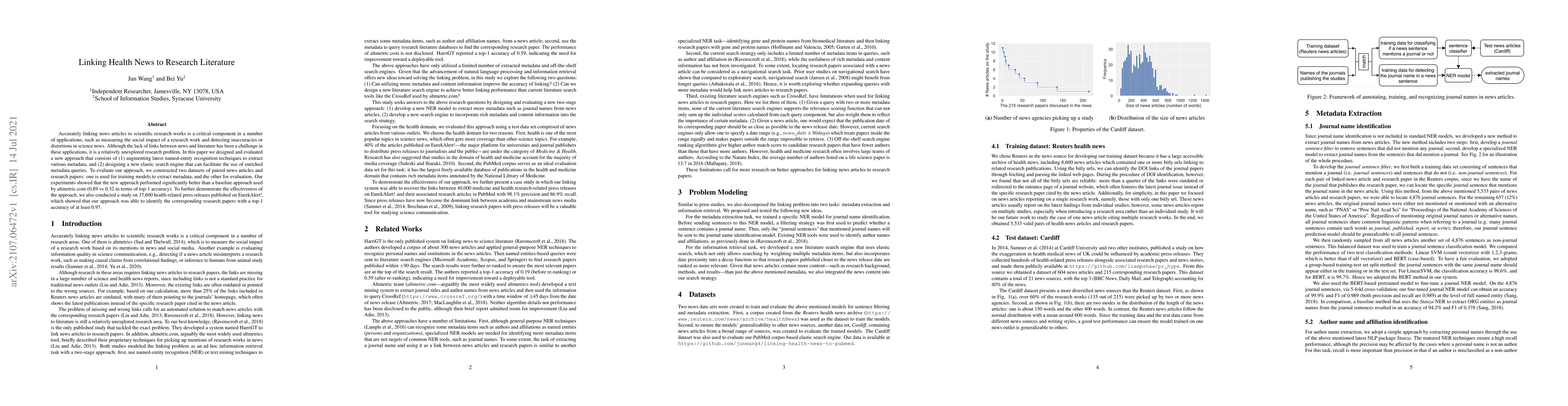 Accurately linking news articles to scientific research works is a critical component in a number of applications, such as measuring the social impact of a research work and detecting inaccuracies or distortions in science news. Although the lack of links between news and literature has been a challenge in these applications, it is a relatively unexplored research problem. In this paper we designed and evaluated a new approach that consists of (1) augmenting latest named-entity recognition techniques to extract various metadata, and (2) designing a new elastic search engine that can facilitate the use of enriched metadata queries. To evaluate our approach, we constructed two datasets of paired news articles and research papers: one is used for training models to extract metadata, and the other for evaluation. Our experiments showed that the new approach performed significantly better than a baseline approach used by altmetric.com (0.89 vs 0.32 in terms of top-1 accuracy). To further demonstrate the effectiveness of the approach, we also conducted a study on 37,600 health-related press releases published on EurekAlert!, which showed that our approach was able to identify the corresponding research papers with a top-1 accuracy of at least 0.97.