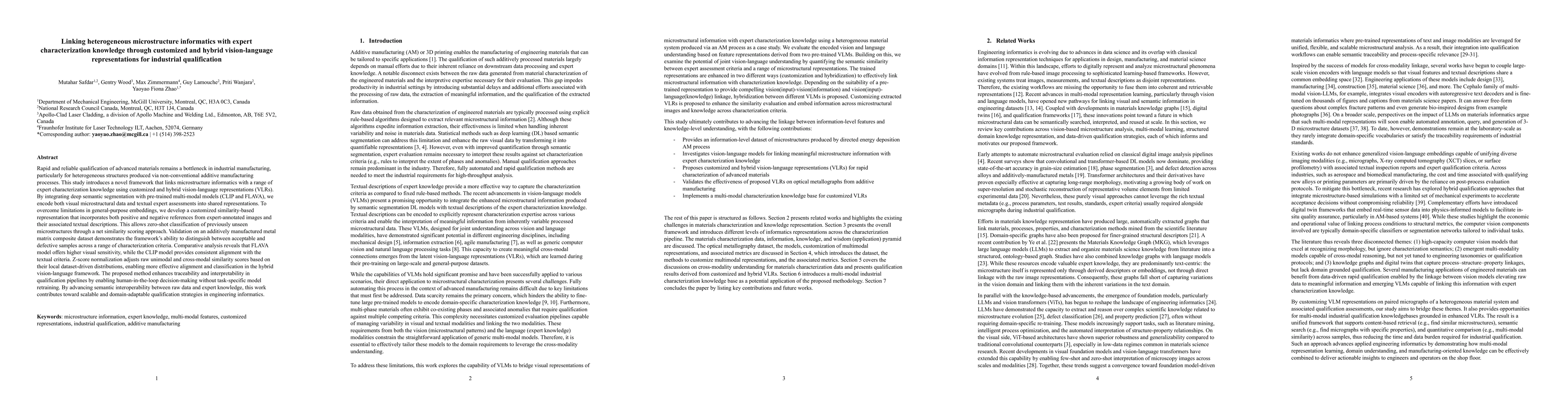 Rapid and reliable qualification of advanced materials remains a bottleneck in industrial manufacturing, particularly for heterogeneous structures produced via non-conventional additive manufacturing processes. This study introduces a novel framework that links microstructure informatics with a range of expert characterization knowledge using customized and hybrid vision-language representations (VLRs). By integrating deep semantic segmentation with pre-trained multi-modal models (CLIP and FLAVA), we encode both visual microstructural data and textual expert assessments into shared representations. To overcome limitations in general-purpose embeddings, we develop a customized similarity-based representation that incorporates both positive and negative references from expert-annotated images and their associated textual descriptions. This allows zero-shot classification of previously unseen microstructures through a net similarity scoring approach. Validation on an additively manufactured metal matrix composite dataset demonstrates the framework's ability to distinguish between acceptable and defective samples across a range of characterization criteria. Comparative analysis reveals that FLAVA model offers higher visual sensitivity, while the CLIP model provides consistent alignment with the textual criteria. Z-score normalization adjusts raw unimodal and cross-modal similarity scores based on their local dataset-driven distributions, enabling more effective alignment and classification in the hybrid vision-language framework. The proposed method enhances traceability and interpretability in qualification pipelines by enabling human-in-the-loop decision-making without task-specific model retraining. By advancing semantic interoperability between raw data and expert knowledge, this work contributes toward scalable and domain-adaptable qualification strategies in engineering informatics.