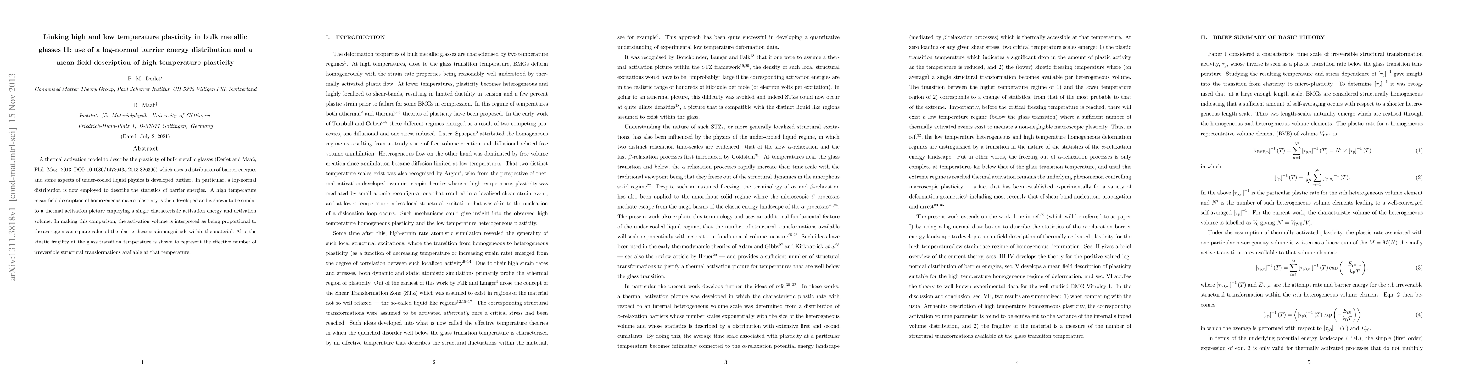 A thermal activation model to describe the plasticity of bulk metallic glasses (Derlet and Maa\ss, Phil. Mag. 2013, DOI: 10.1080/14786435.2013.826396) which uses a distribution of barrier energies and some aspects of under-cooled liquid physics is developed further. In particular, a log-normal distribution is now employed to describe the statistics of barrier energies. A high temperature mean-field description of homogeneous macro-plasticity is then developed and is shown to be similar to a thermal activation picture employing a single characteristic activation energy and activation volume. In making this comparison, the activation volume is interpreted as being proportional to the average mean-square-value of the plastic shear strain magnitude within the material. Also, the kinetic fragility at the glass transition temperature is shown to represent the effective number of irreversible structural transformations available at that temperature.