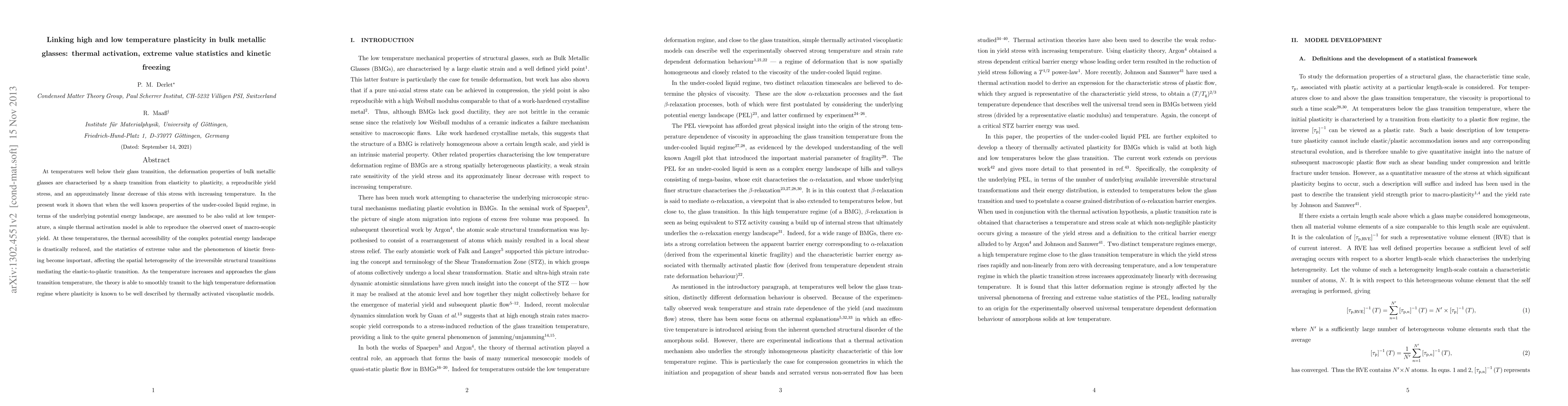 This paper demonstrates that a thermal activation model can explain the transition from elasticity to plasticity in bulk metallic glasses at low temperatures, linking it to the potential energy landscape. It also explores how extreme value statistics and kinetic freezing influence the deformation process, bridging the gap between low and high temperature plasticity regimes.