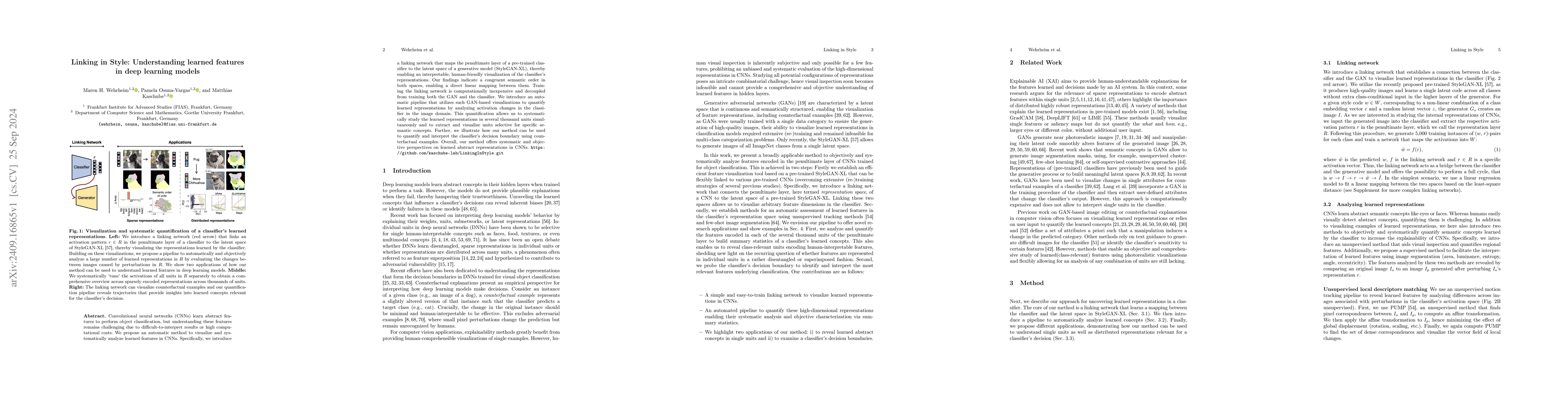 Convolutional neural networks (CNNs) learn abstract features to perform object classification, but understanding these features remains challenging due to difficult-to-interpret results or high computational costs. We propose an automatic method to visualize and systematically analyze learned features in CNNs. Specifically, we introduce a linking network that maps the penultimate layer of a pre-trained classifier to the latent space of a generative model (StyleGAN-XL), thereby enabling an interpretable, human-friendly visualization of the classifier's representations. Our findings indicate a congruent semantic order in both spaces, enabling a direct linear mapping between them. Training the linking network is computationally inexpensive and decoupled from training both the GAN and the classifier. We introduce an automatic pipeline that utilizes such GAN-based visualizations to quantify learned representations by analyzing activation changes in the classifier in the image domain. This quantification allows us to systematically study the learned representations in several thousand units simultaneously and to extract and visualize units selective for specific semantic concepts. Further, we illustrate how our method can be used to quantify and interpret the classifier's decision boundary using counterfactual examples. Overall, our method offers systematic and objective perspectives on learned abstract representations in CNNs. https://github.com/kaschube-lab/LinkingInStyle.git