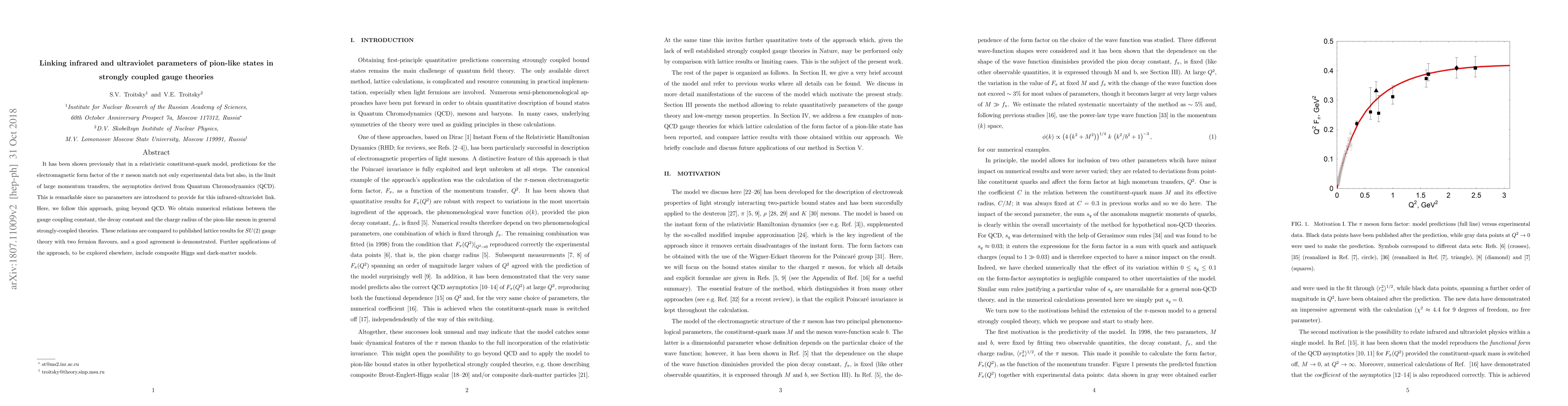 It has been shown previously that in a relativistic constituent-quark model, predictions for the electromagnetic form factor of the pi meson match not only experimental data but also, in the limit of large momentum transfers, the asymptotics derived from Quantum Chromodynamics (QCD). This is remarkable since no parameters are introduced to provide for this infrared-ultraviolet link. Here, we follow this approach, going beyond QCD. We obtain numerical relations between the gauge coupling constant, the decay constant and the charge radius of the pion-like meson in general strongly-coupled theories. These relations are compared to published lattice results for SU(2) gauge theory with two fermion flavours, and a good agreement is demonstrated. Further applications of the approach, to be explored elsewhere, include composite Higgs and dark-matter models.