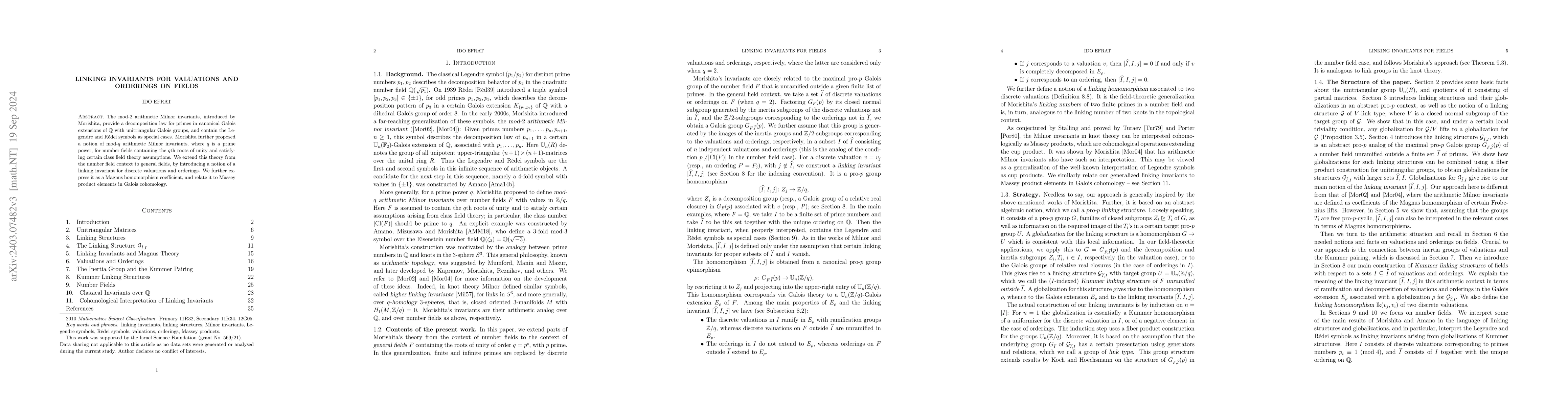 Summary: This paper extends Morishita's notion of mod-q arithmetic Milnor invariants from number fields to general fields, introducing linking invariants for discrete valuations and orderings. It connects these invariants to Massey products in Galois cohomology via a Magnus homomorphism coefficient.