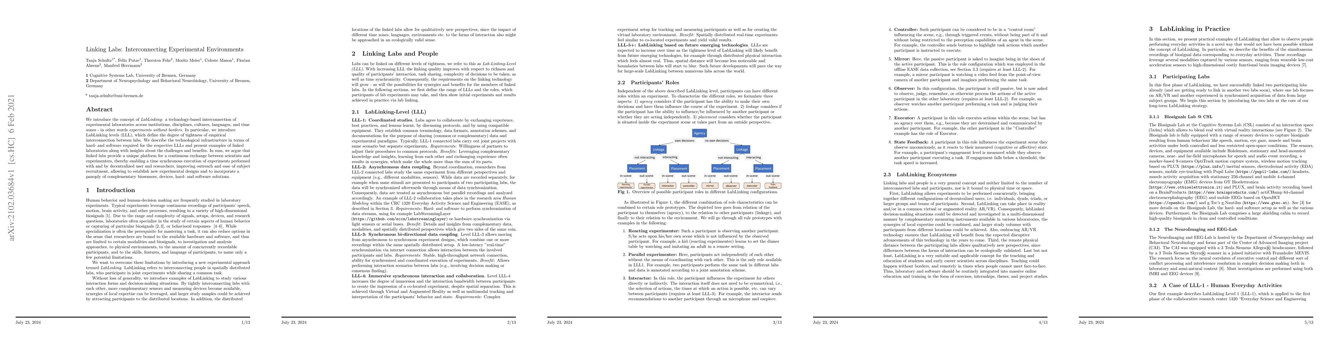 We introduce the concept of LabLinking: a technology-based interconnection of experimental laboratories across institutions, disciplines, cultures, languages, and time zones - in other words experiments without borders. In particular, we introduce LabLinking levels (LLL), which define the degree of tightness of empirical interconnection between labs. We describe the technological infrastructure in terms of hard- and software required for the respective LLLs and present examples of linked laboratories along with insights about the challenges and benefits. In sum, we argue that linked labs provide a unique platform for a continuous exchange between scientists and experimenters, thereby enabling a time synchronous execution of experiments performed with and by decentralized user and researchers, improving outreach and ease of subject recruitment, allowing to establish new experimental designs and to incorporate a panoply of complementary biosensors, devices, hard- and software solutions.