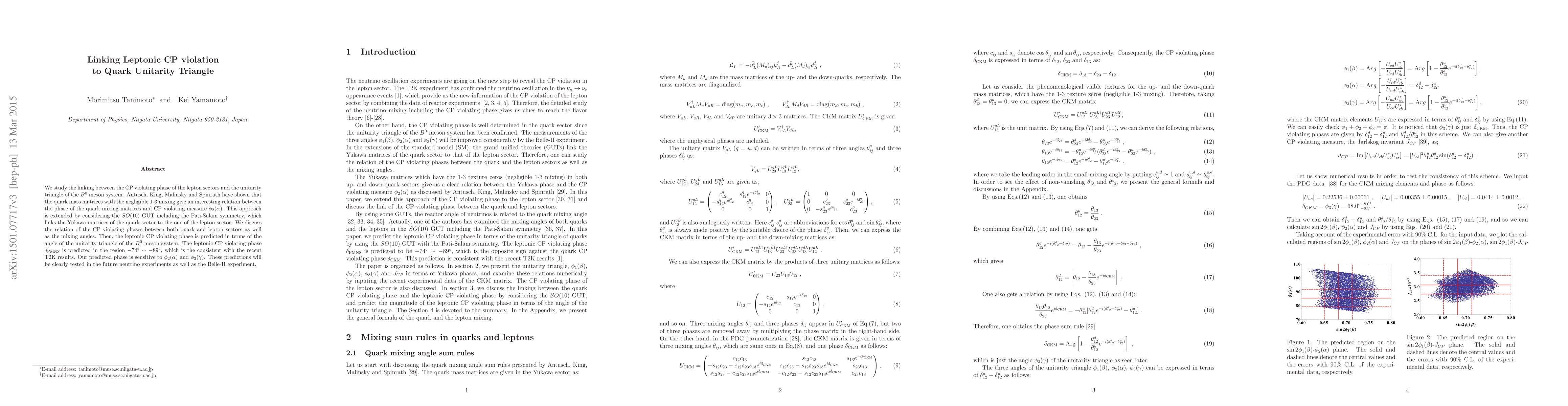 This paper extends the connection between leptonic CP violation and the quark unitarity triangle, proposing that the leptonic CP violating phase δPMNS can be predicted using the angle of the B0 meson unitarity triangle, within the range -74 to -89 degrees, consistent with recent T2K results. The study utilizes SO(10) GUT and Pati-Salam symmetry to link quark and lepton Yukawa matrices, predicting the leptonic phase sensitivity to phi_2(alpha) and phi_3(gamma).
