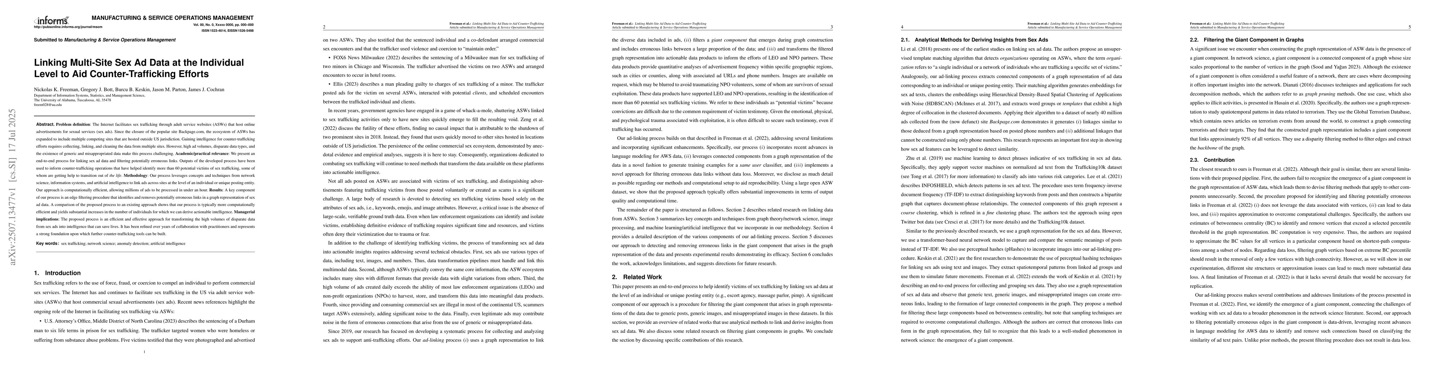 The Internet facilitates sex trafficking through adult service websites (ASWs) that host online advertisements for sexual services (sex ads). Since the closure of the popular site Backpage.com, the ecosystem of ASWs has expanded to include multiple competing sites that are hosted outside US jurisdiction. Gaining intelligence for counter-trafficking efforts requires collecting, linking, and cleaning the data from multiple sites. However, high ad volumes, disparate data types, and the existence of generic and misappropriated data make this process challenging. We present an end-to-end process for linking sex ad data and filtering potentially erroneous links. Outputs of the developed process have been used to inform counter-trafficking operations that have helped identify more than 60 potential victims of sex trafficking, some of whom are getting help to transition out of the life. Our process leverages concepts and techniques from network science, information systems, and artificial intelligence to link ads across sites at the level of an individual or unique posting entity. Our approach is computationally efficient, allowing millions of ads to be processed in under an hour. A key component of our process is an edge filtering procedure that identifies and removes potentially erroneous links in a graph representation of sex ad data. A comparison of the proposed process to an existing approach shows that our process is typically more computationally efficient and yields substantial increases in the number of individuals for which we can derive actionable intelligence. The proposed process is an efficient and effective approach for transforming the high volumes of disparate data from sex ads into intelligence that can save lives. It has been refined over years of collaboration with practitioners and represents a strong foundation upon which further counter-trafficking tools can be built.
