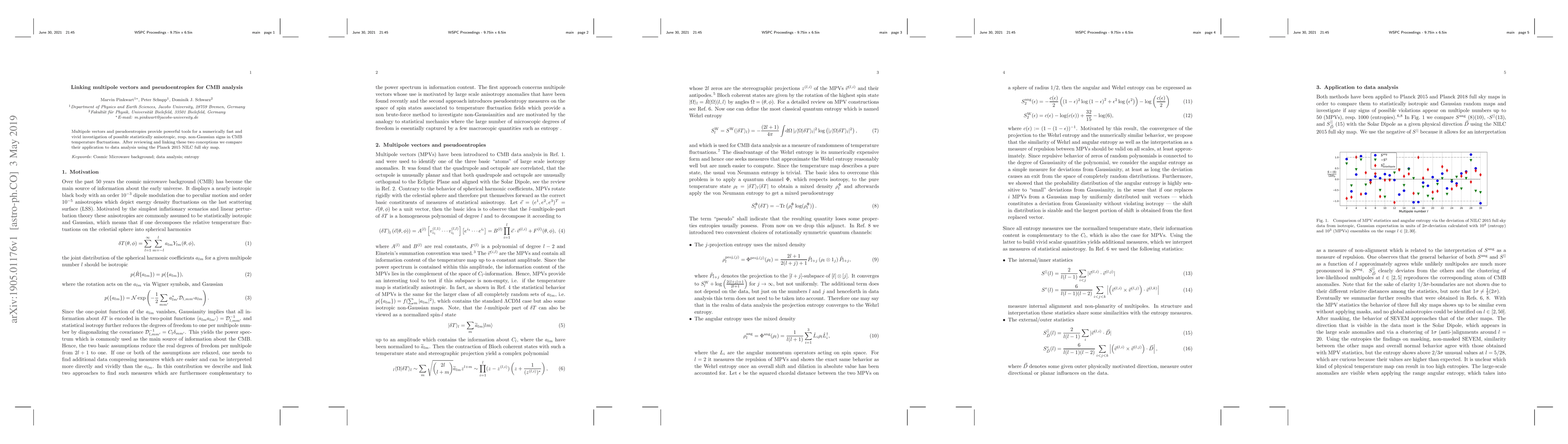 Multipole vectors and pseudoentropies provide powerful tools for a numerically fast and vivid investigation of possible statistically anisotropic, respectively non-Gaussian signs in CMB temperature fluctuations. After reviewing and linking these two conceptions we compare their application to data analysis using the Planck 2015 NILC full sky map.