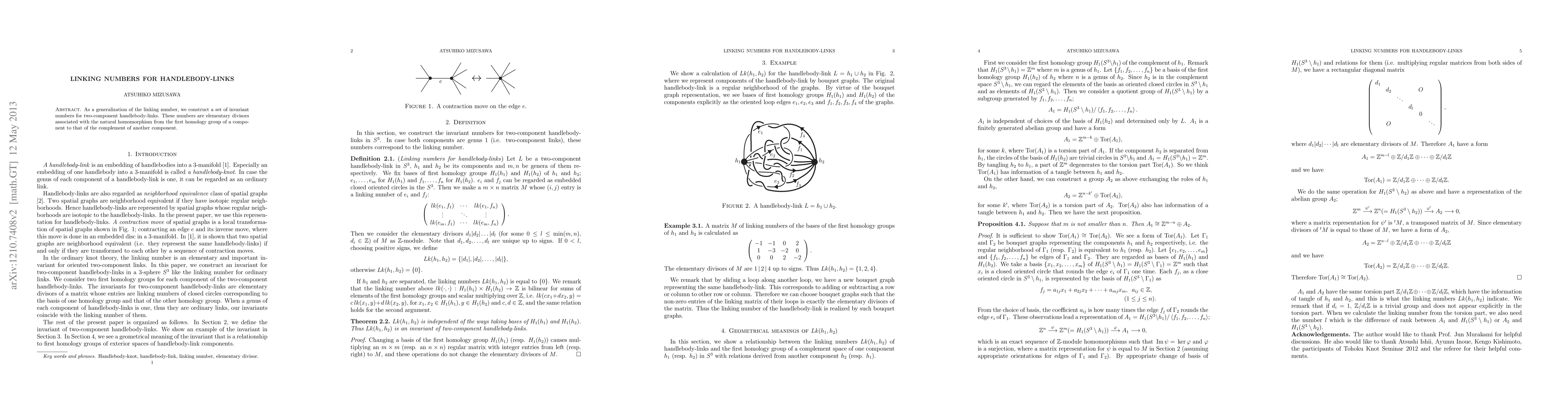 Summary: This paper introduces a set of invariant numbers for two-component handlebody-links, extending the concept of linking number, based on elementary divisors linked to the homomorphism between the first homology groups of the components. These invariants provide a new perspective on the topological structure of handlebody-links.
