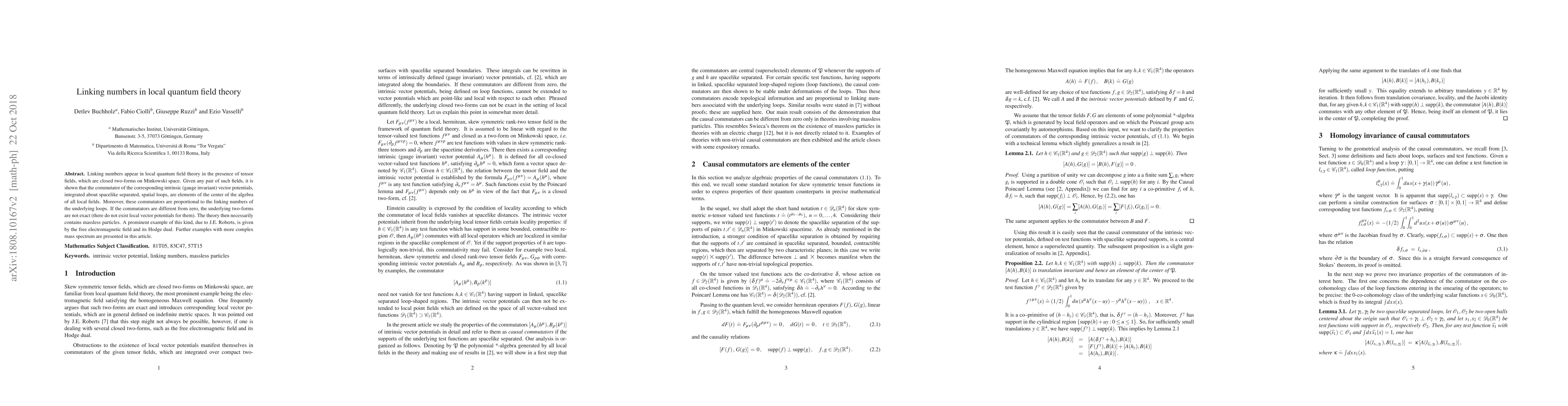 Research shows that linking numbers in local quantum field theory relate to the commutators of vector potentials, which are proportional to the underlying loops' linking numbers, indicating the presence of massless particles in non-exact two-forms.