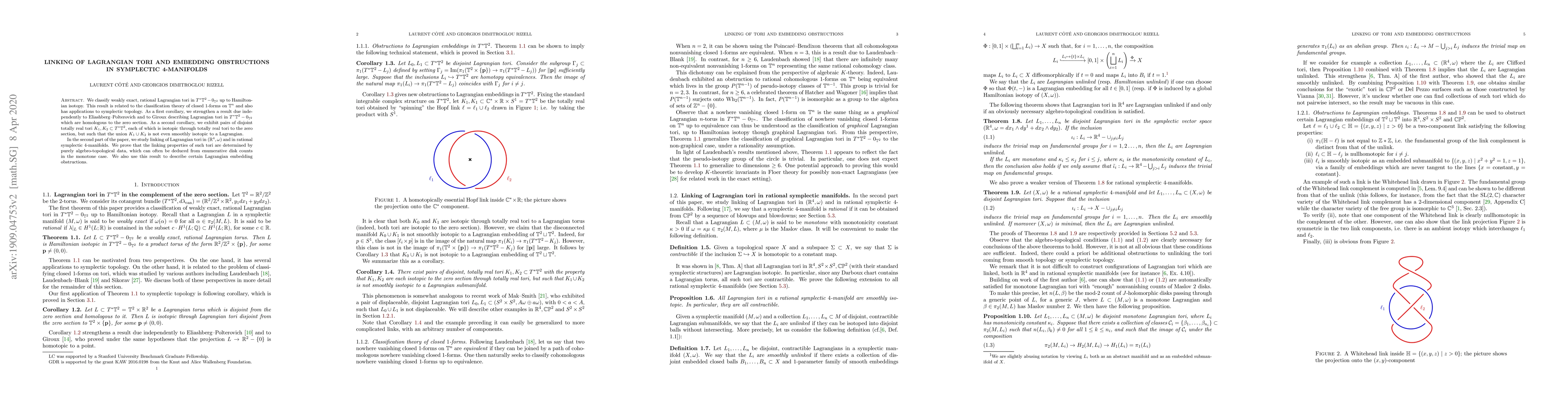 We classify weakly exact, rational Lagrangian tori in $T^* \mathbb{T}^2- 0_{\mathbb{T}^2}$ up to Hamiltonian isotopy. This result is related to the classification theory of closed $1$-forms on $\mathbb{T}^n$ and also has applications to symplectic topology. As a first corollary, we strengthen a result due independently to Eliashberg-Polterovich and to Giroux describing Lagrangian tori in $T^* \mathbb{T}^2-0_{\mathbb{T}^2}$ which are homologous to the zero section. As a second corollary, we exhibit pairs of disjoint totally real tori $K_1, K_2 \subset T^*\mathbb{T}^2$, each of which is isotopic through totally real tori to the zero section, but such that the union $K_1 \cup K_2$ is not even smoothly isotopic to a Lagrangian. In the second part of the paper, we study linking of Lagrangian tori in $(\mathbb{R}^4, \omega)$ and in rational symplectic $4$-manifolds. We prove that the linking properties of such tori are determined by purely algebro-topological data, which can often be deduced from enumerative disk counts in the monotone case. We also use this result to describe certain Lagrangian embedding obstructions.