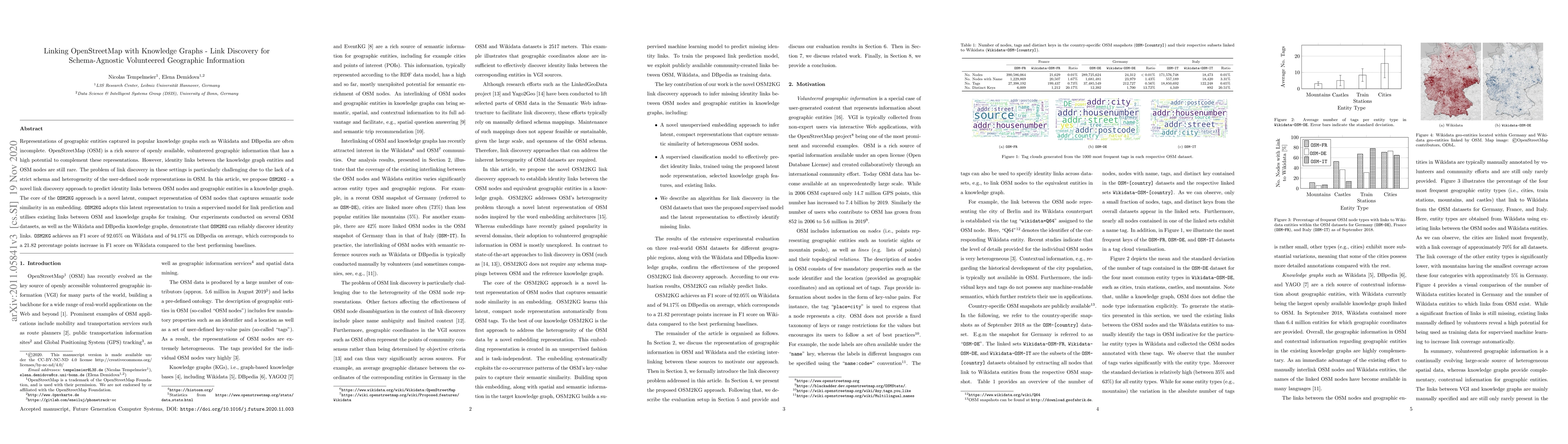 This paper proposes OSM2KG, a novel link discovery approach to identify identity links between OpenStreetMap nodes and geographic entities in knowledge graphs like Wikidata and DBpedia. OSM2KG uses a latent representation of OSM nodes to train a supervised model for link prediction, achieving an average F1 score of 92.05% on Wikidata and 94.17% on DBpedia, significantly outperforming existing baselines.