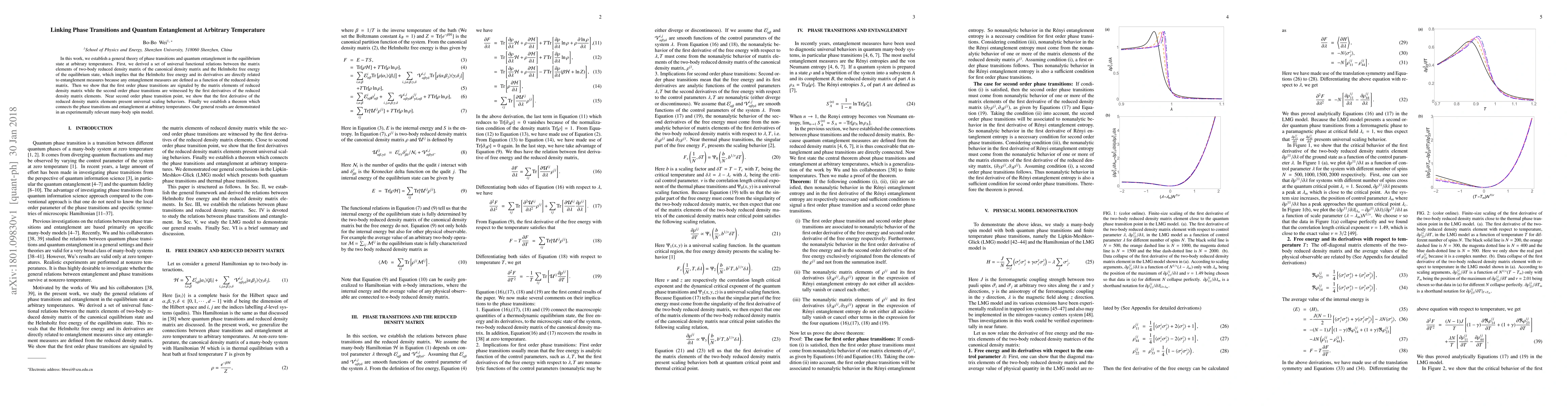 This paper develops a theory linking phase transitions and quantum entanglement across all temperatures, showing universal functional relations between the reduced density matrix and Helmholtz free energy. It reveals that first-order phase transitions are indicated by changes in reduced density matrix elements, while second-order transitions are marked by their first derivatives, exhibiting universal scaling behaviors near the transition point.