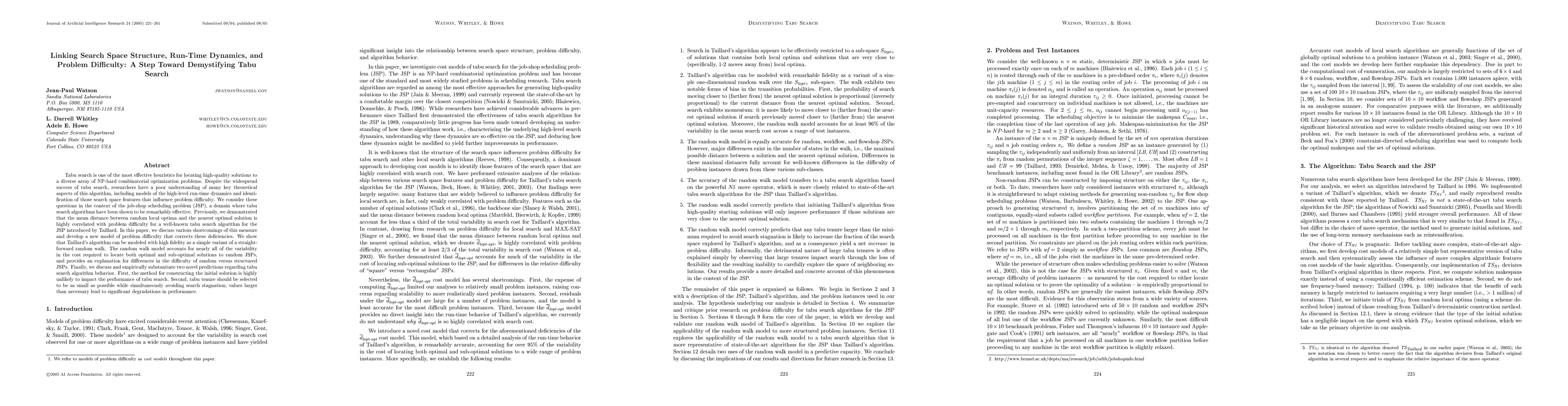 Tabu search is one of the most effective heuristics for locating high-quality solutions to a diverse array of NP-hard combinatorial optimization problems. Despite the widespread success of tabu search, researchers have a poor understanding of many key theoretical aspects of this algorithm, including models of the high-level run-time dynamics and identification of those search space features that influence problem difficulty. We consider these questions in the context of the job-shop scheduling problem (JSP), a domain where tabu search algorithms have been shown to be remarkably effective. Previously, we demonstrated that the mean distance between random local optima and the nearest optimal solution is highly correlated with problem difficulty for a well-known tabu search algorithm for the JSP introduced by Taillard. In this paper, we discuss various shortcomings of this measure and develop a new model of problem difficulty that corrects these deficiencies. We show that Taillards algorithm can be modeled with high fidelity as a simple variant of a straightforward random walk. The random walk model accounts for nearly all of the variability in the cost required to locate both optimal and sub-optimal solutions to random JSPs, and provides an explanation for differences in the difficulty of random versus structured JSPs. Finally, we discuss and empirically substantiate two novel predictions regarding tabu search algorithm behavior. First, the method for constructing the initial solution is highly unlikely to impact the performance of tabu search. Second, tabu tenure should be selected to be as small as possible while simultaneously avoiding search stagnation; values larger than necessary lead to significant degradations in performance.