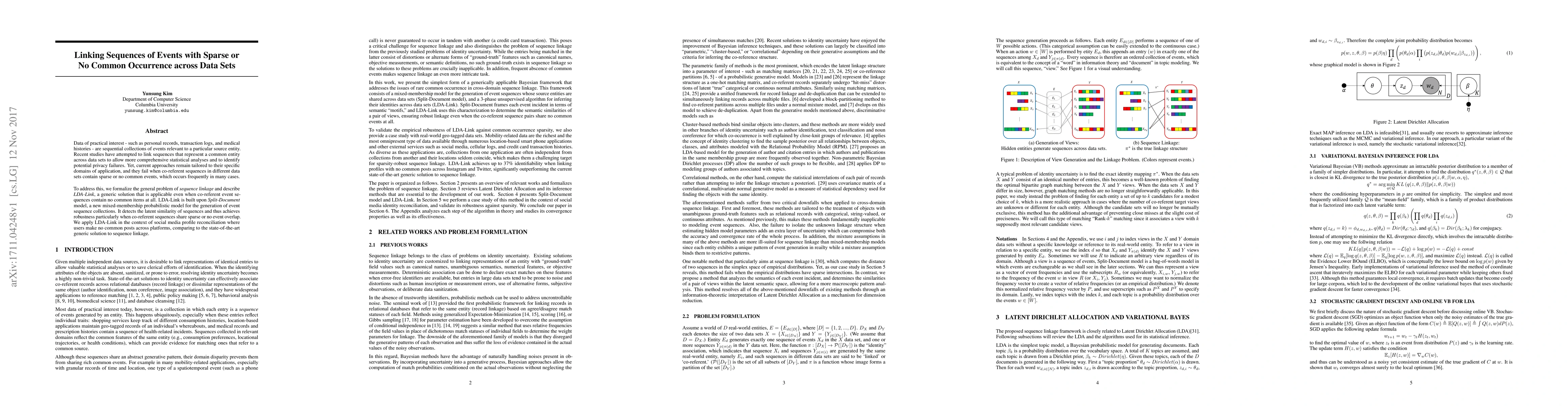 Data of practical interest - such as personal records, transaction logs, and medical histories - are sequential collections of events relevant to a particular source entity. Recent studies have attempted to link sequences that represent a common entity across data sets to allow more comprehensive statistical analyses and to identify potential privacy failures. Yet, current approaches remain tailored to their specific domains of application, and they fail when co-referent sequences in different data sets contain sparse or no common events, which occurs frequently in many cases. To address this, we formalize the general problem of "sequence linkage" and describe "LDA-Link," a generic solution that is applicable even when co-referent event sequences contain no common items at all. LDA-Link is built upon "Split-Document" model, a new mixed-membership probabilistic model for the generation of event sequence collections. It detects the latent similarity of sequences and thus achieves robustness particularly when co-referent sequences share sparse or no event overlap. We apply LDA-Link in the context of social media profile reconciliation where users make no common posts across platforms, comparing to the state-of-the-art generic solution to sequence linkage.