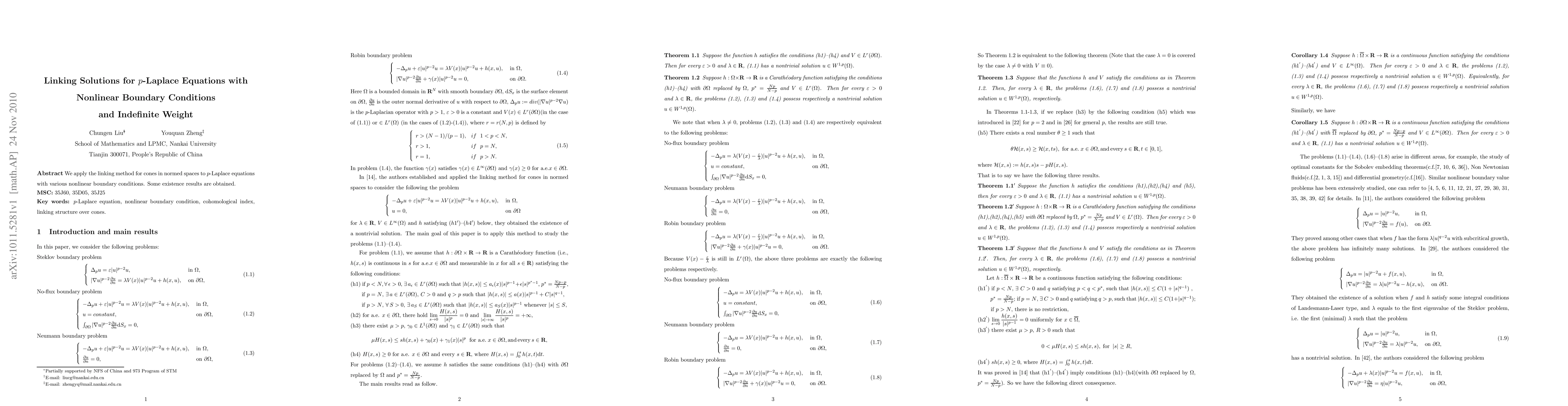 Summary: This paper utilizes the linking method for cones in normed spaces to establish existence results for p-Laplace equations under diverse nonlinear boundary conditions and indefinite weight functions. The study focuses on the application of advanced topological methods to solve complex partial differential equations.