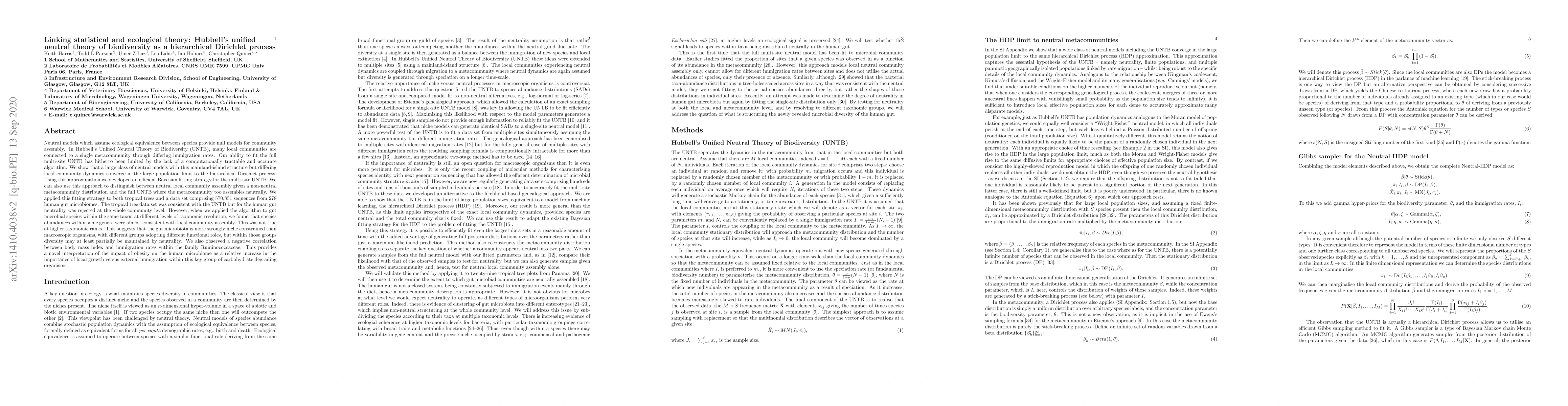 Neutral models which assume ecological equivalence between species provide null models for community assembly. In Hubbell's Unified Neutral Theory of Biodiversity (UNTB), many local communities are connected to a single metacommunity through differing immigration rates. Our ability to fit the full multi-site UNTB has hitherto been limited by the lack of a computationally tractable and accurate algorithm. We show that a large class of neutral models with this mainland-island structure but differing local community dynamics converge in the large population limit to the hierarchical Dirichlet process. Using this approximation we developed an efficient Bayesian fitting strategy for the multi-site UNTB. We can also use this approach to distinguish between neutral local community assembly given a non-neutral metacommunity distribution and the full UNTB where the metacommunity too assembles neutrally. We applied this fitting strategy to both tropical trees and a data set comprising 570,851 sequences from 278 human gut microbiomes. The tropical tree data set was consistent with the UNTB but for the human gut neutrality was rejected at the whole community level. However, when we applied the algorithm to gut microbial species within the same taxon at different levels of taxonomic resolution, we found that species abundances within some genera were almost consistent with local community assembly. This was not true at higher taxonomic ranks. This suggests that the gut microbiota is more strongly niche constrained than macroscopic organisms, with different groups adopting different functional roles, but within those groups diversity may at least partially be maintained by neutrality.We also observed a negative correlation between body mass index and immigration rates within the family Ruminococcaceae.