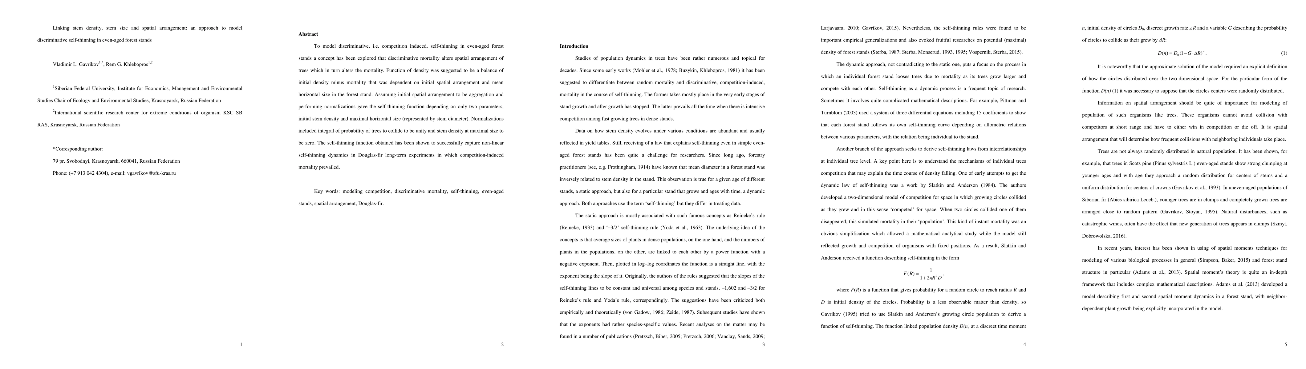 This paper proposes a model for discriminative self-thinning in even-aged forest stands, suggesting that competition-induced mortality alters tree spatial arrangement and density. The self-thinning function derived depends on initial stem density and maximal size, successfully capturing observed non-linear dynamics in Douglas-fir experiments.