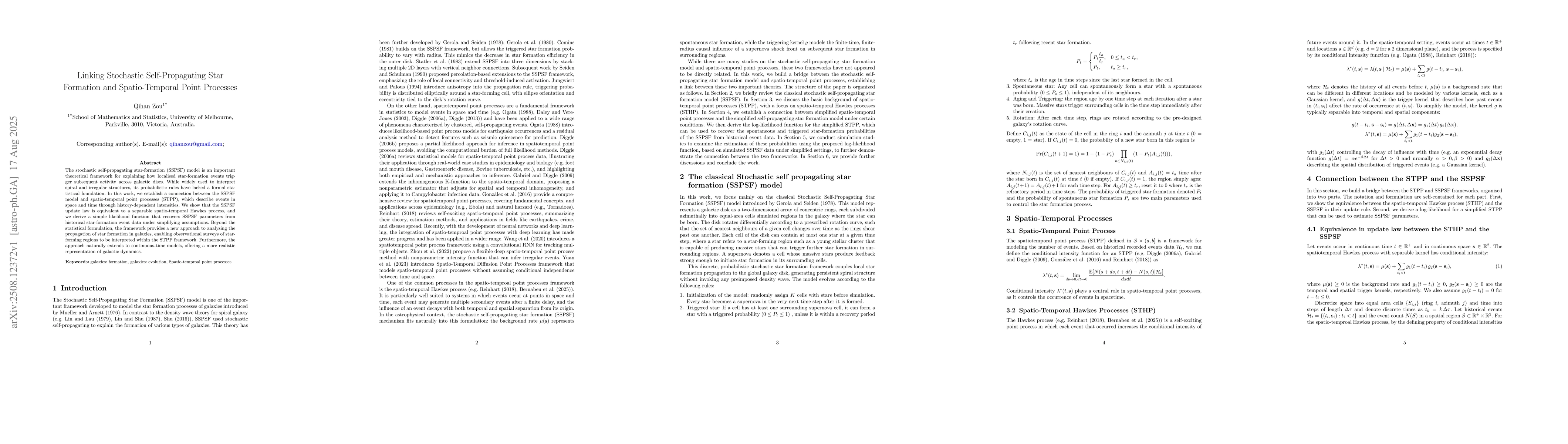 The stochastic self-propagating star-formation (SSPSF) model is an important theoretical framework for explaining how localised star-formation events trigger subsequent activity across galactic discs. While widely used to interpret spiral and irregular structures, its probabilistic rules have lacked a formal statistical foundation. In this work, we establish a connection between the SSPSF model and spatio-temporal point processes (STPP), which describe events in space and time through history-dependent intensities. We show that the SSPSF update law is equivalent to a separable spatio-temporal Hawkes process, and we derive a simple likelihood function that recovers SSPSF parameters from historical star-formation event data under simplifying assumptions. Beyond the statistical formulation, the framework provides a new approach to analysing the propagation of star formation in galaxies, enabling observational surveys of star-forming regions to be interpreted within the STPP framework. Furthermore, the approach naturally extends to continuous-time models, offering a more realistic representation of galactic dynamics.
