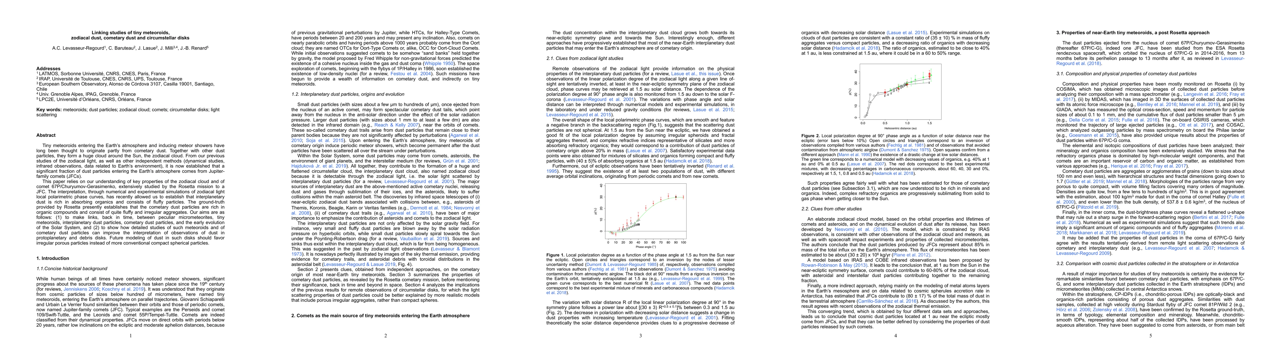 Tiny meteoroids entering the Earth's atmosphere and inducing meteor showers have long been thought to originate partly from cometary dust. Together with other dust particles, they form a huge cloud around the Sun, the zodiacal cloud. From our previous studies of the zodiacal light, as well as other independent methods (dynamical studies, infrared observations, data related to Earth's environment), it is now established that a significant fraction of dust particles entering the Earth's atmosphere comes from Jupiter-family comets (JFCs). This paper relies on our understanding of key properties of the zodiacal cloud and of comet 67P/Churyumov-Gerasimenko, extensively studied by the Rosetta mission to a JFC. The interpretation, through numerical and experimental simulations of zodiacal light local polarimetric phase curves, has recently allowed us to establish that interplanetary dust is rich in absorbing organics and consists of fluffy particles. The ground-truth provided by Rosetta presently establishes that the cometary dust particles are rich in organic compounds and consist of quite fluffy and irregular aggregates. Our aims are as follows: (1) to make links, back in time, between peculiar micrometeorites, tiny meteoroids, interplanetary dust particles, cometary dust particles, and the early evolution of the Solar System, and (2) to show how detailed studies of such meteoroids and of cometary dust particles can improve the interpretation of observations of dust in protoplanetary and debris disks. Future modeling of dust in such disks should favor irregular porous particles instead of more conventional compact spherical particles.