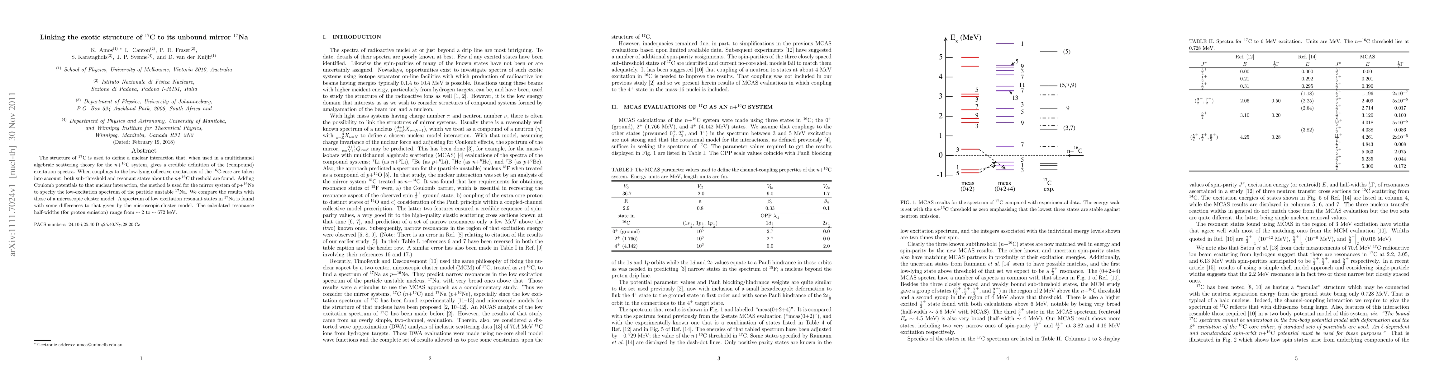 The structure of ${}^{17}$C is used to define a nuclear interaction that, when used in a multichannel algebraic scattering theory for the $n+{}^{16}$C system, gives a credible definition of the (compound) excitation spectra. When couplings to the low-lying collective excitations of the ${}^{16}$C-core are taken into account, both sub-threshold and resonant states about the $n+{}^{16}$C threshold are found. Adding Coulomb potentials to that nuclear interaction, the method is used for the mirror system of $p+{}^{16}$Ne to specify the low-excitation spectrum of the particle unstable $^{17}$Na. We compare the results with those of a microscopic cluster model. A spectrum of low excitation resonant states in ${}^{17}$Na is found with some differences to that given by the microscopic-cluster model. The calculated resonance half-widths (for proton emission) range from $\sim 2$ to $\sim 672$ keV.
