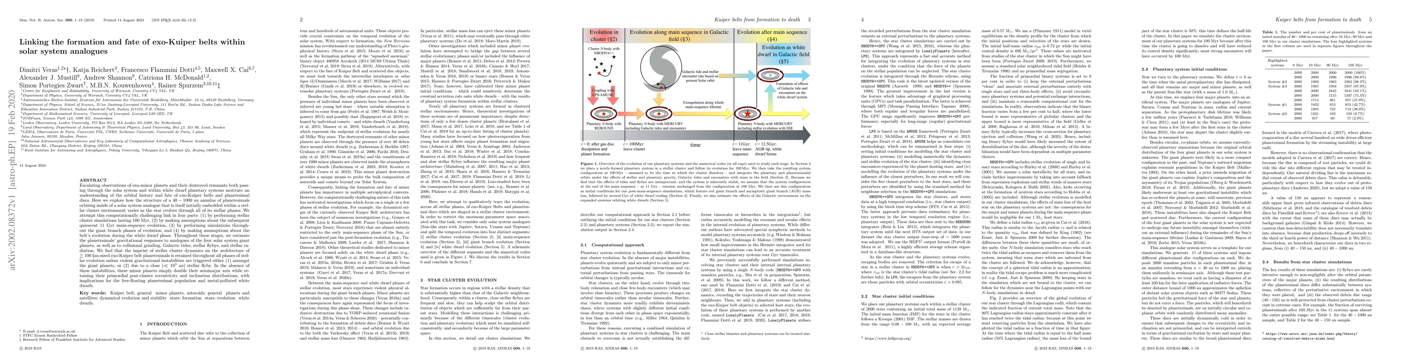 Escalating observations of exo-minor planets and their destroyed remnants both passing through the solar system and within white dwarf planetary systems motivate an understanding of the orbital history and fate of exo-Kuiper belts and planetesimal discs. Here we explore how the structure of a 40-1000 au annulus of planetesimals orbiting inside of a solar system analogue that is itself initially embedded within a stellar cluster environment varies as the star evolves through all of its stellar phases. We attempt this computationally challenging link in four parts: (1) by performing stellar cluster simulations lasting 100 Myr, (2) by making assumptions about the subsequent quiescent 11 Gyr main-sequence evolution, (3) by performing simulations throughout the giant branch phases of evolution, and (4) by making assumptions about the belt's evolution during the white dwarf phase. Throughout these stages, we estimate the planetesimals' gravitational responses to analogues of the four solar system giant planets, as well as to collisional grinding, Galactic tides, stellar flybys, and stellar radiation. We find that the imprint of stellar cluster dynamics on the architecture of $\gtrsim 100$ km-sized exo-Kuiper belt planetesimals is retained throughout all phases of stellar evolution unless violent gravitational instabilities are triggered either (1) amongst the giant planets, or (2) due to a close ($\ll 10^3$ au) stellar flyby. In the absence of these instabilities, these minor planets simply double their semimajor axis while retaining their primordial post-cluster eccentricity and inclination distributions, with implications for the free-floating planetesimal population and metal-polluted white dwarfs.