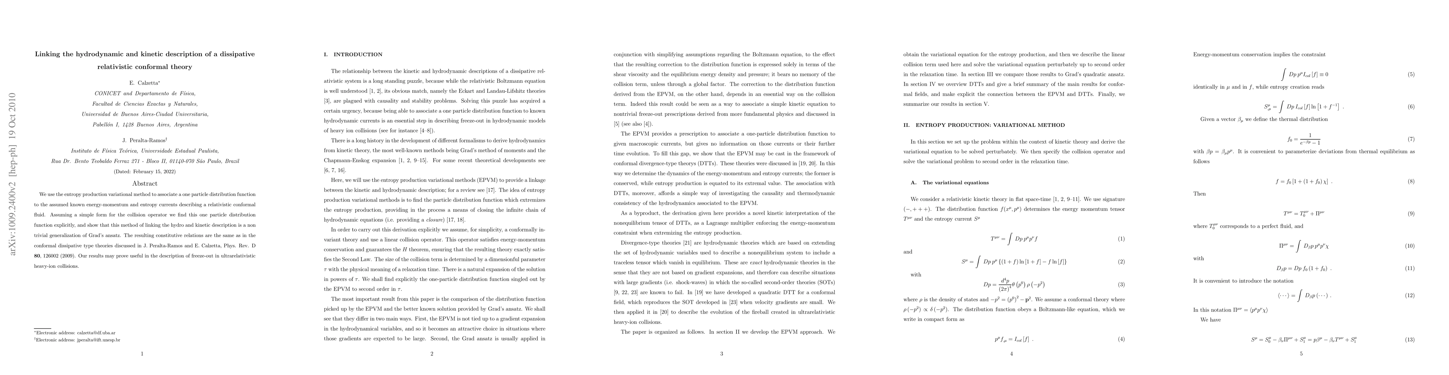 Researchers used entropy production to link hydrodynamic and kinetic descriptions of a relativistic conformal theory, finding constitutive relations that match previous findings on freeze-out in heavy-ion collisions.