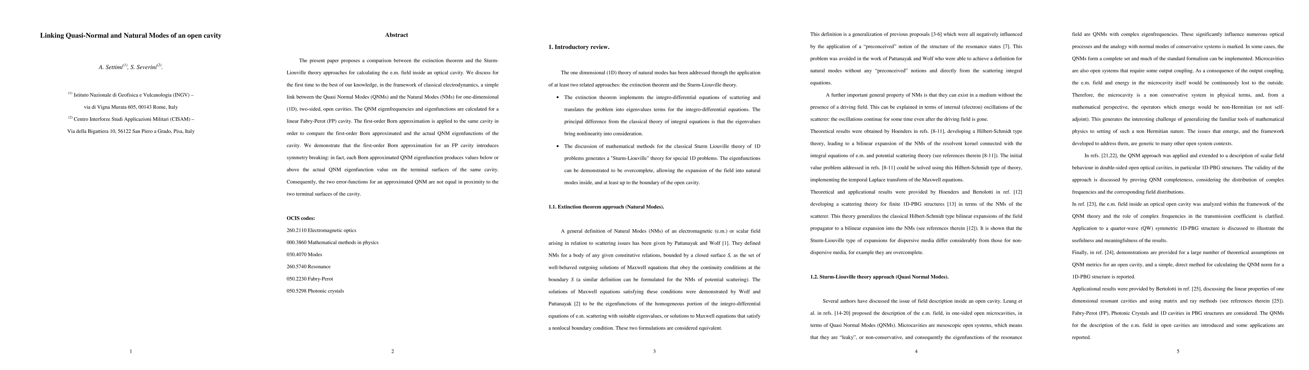 The present paper proposes a comparison between the extinction theorem and the Sturm-Liouville theory approaches for calculating the e.m. field inside an optical cavity. We discuss for the first time to the best of our knowledge, in the framework of classical electrodynamics, a simple link between the Quasi Normal Modes (QNMs) and the Natural Modes (NMs) for one-dimensional (1D), two-sided, open cavities. The QNM eigenfrequencies and eigenfunctions are calculated for a linear Fabry-Perot (FP) cavity. The first-order Born approximation is applied to the same cavity in order to compare the first-order Born approximated and the actual QNM eigenfunctions of the cavity. We demonstrate that the first-order Born approximation for an FP cavity introduces symmetry breaking: in fact, each Born approximated QNM eigenfunction produces values below or above the actual QNM eigenfunction value on the terminal surfaces of the same cavity. Consequently, the two error-functions for an approximated QNM are not equal in proximity to the two terminal surfaces of the cavity.