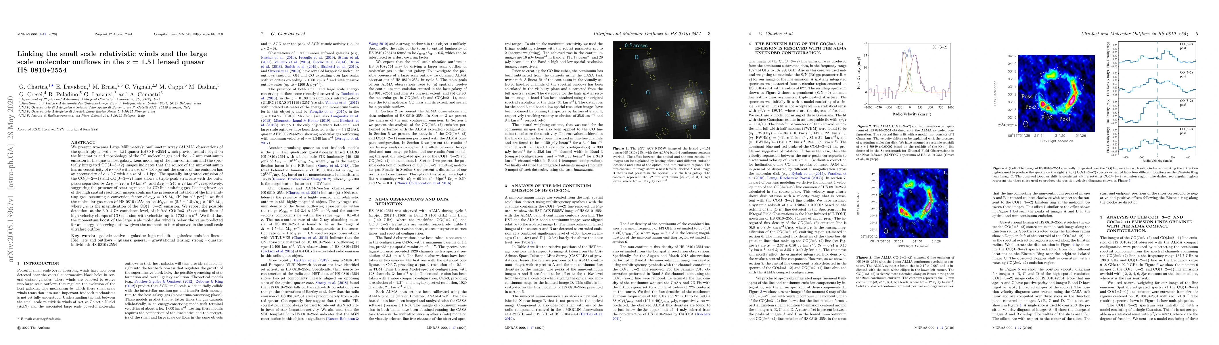 We present Atacama Large Millimeter/submillimeter Array (ALMA) observations of the quadruply lensed z=1.51 quasar HS 0810+2554 which provide useful insight on the kinematics and morphology of the CO molecular gas and the ~2 mm continuum emission in the quasar host galaxy. Lens modeling of the mm-continuum and the spectrally integrated CO(3-2) images indicates that the source of the mm-continuum has an eccentricity of e~0.9 with a size of ~1.6 kpc and the source of line emission has an eccentricity of e~0.7 with a size of ~1 kpc. The spatially integrated emission of the CO(2-1) and CO(3-2) lines shows a triple peak structure with the outer peaks separated by Dv_21 = 220 +\- 19 km s^-1 and Dv_32 = 245 +/- 28 km s^-1, respectively, suggesting the presence of rotating molecular CO line emitting gas. Lensing inversion of the high spatial resolution images confirms the presence of rotation of the line emitting gas. Assuming a conversion factor of alpha_CO = 0.8 M_solar (K km s^-1 pc^2)^-1 we find the molecular gas mass of HS 0810+2554 to be M _ Mol = [(5.2 +/- 1.5)/mu_32] x10^10 M_solar, where mu_32 is the magnification of the CO(3-2) emission. We report the possible detection, at the 3.0 - 4.7 sigma confidence level, of shifted CO(3-2) emission lines of high-velocity clumps of CO emission with velocities up to 1702 km s^-1. We find that the momentum boost of the large scale molecular wind is below the value predicted for an energy-conserving outflow given the momentum flux observed in the small scale ultrafast outflow.