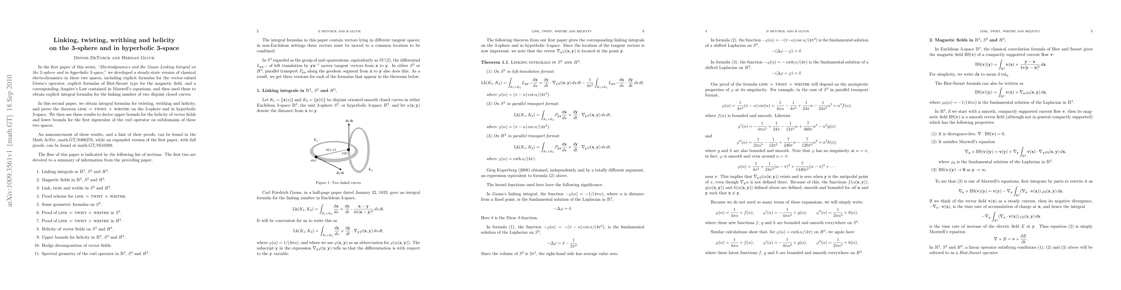 This paper provides integral formulas for twisting, writhing, and helicity in 3-sphere and hyperbolic 3-space, proving the LINK = TWIST + WRITHE theorem, and derives bounds for helicity and the first eigenvalue of the curl operator in these spaces.