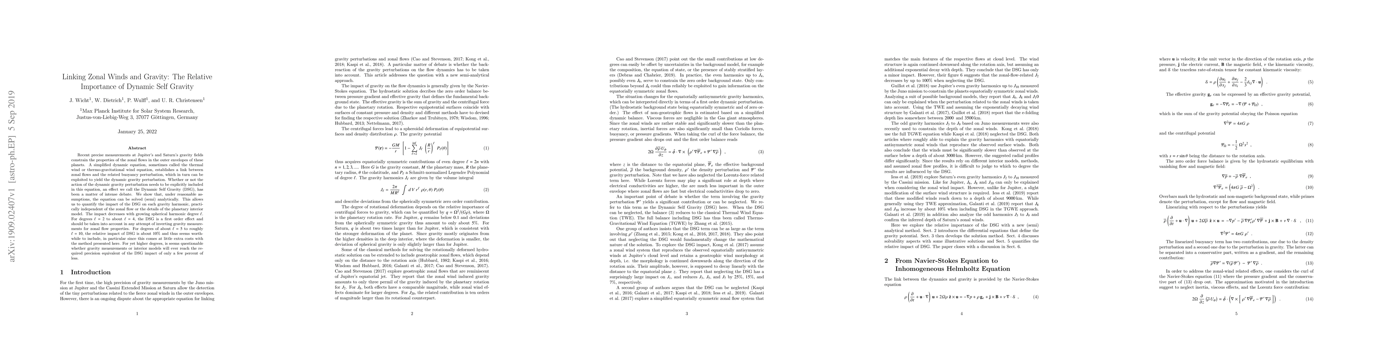 Recent precise measurements at Jupiter's and Saturn's gravity fields constrain the properties of the zonal flows in the outer envelopes of these planets. A simplified dynamic equation, sometimes called the thermal wind or thermo-gravitational wind equation, establishes a link between zonal flows and the related buoyancy perturbation, which in turn can be exploited to yield the dynamic gravity perturbation. Whether or not the action of the dynamic gravity perturbation needs to be explicitly included in this equation, an effect we call the Dynamic Self Gravity (DSG), has been a matter of intense debate. We show that, under reasonable assumptions, the equation can be solved (semi) analytically. This allows us to quantify the impact of the DSG on each gravity harmonic, practically independent of the zonal flow or the details of the planetary interior model. The impact decreases with growing spherical harmonic degree l. For degrees l=2 to about l=4, the DSG is a first order effect and should be taken into account in any attempt of inverting gravity measurements for zonal flow properties. For degrees of about l=5 to roughly l=10, the relative impact of DSG is about 10% and thus seems worthwhile to include, in particular since this comes at little extra costs with the method presented here. For yet higher degrees, is seems questionable whether gravity measurements or interior models will ever reach the required precision equivalent of the DSG impact of only a few percent of less.
