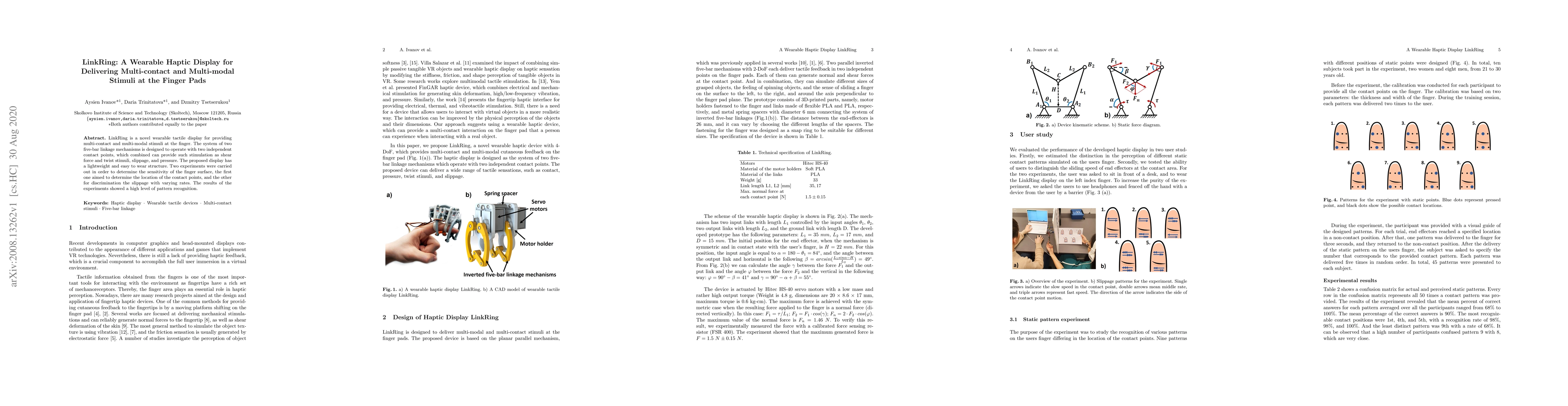 LinkRing is a wearable haptic display that uses two five-bar linkage mechanisms to deliver multi-contact and multi-modal tactile stimuli at the finger pads. Experiments demonstrated high sensitivity and pattern recognition for shear force, twist, slippage, and pressure stimuli.