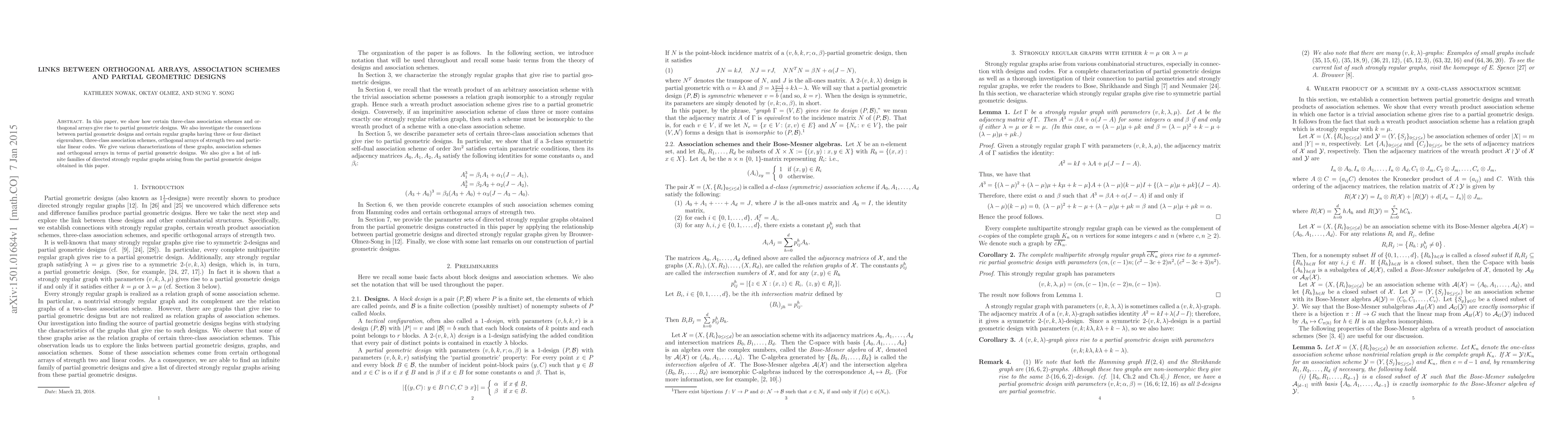 This paper explores the relationships between orthogonal arrays, association schemes, and partial geometric designs, demonstrating how they generate specific partial geometric designs. It also investigates connections between these designs and regular graphs with unique eigenvalues, providing characterizations and listing infinite families of directed strongly regular graphs derived from these designs.