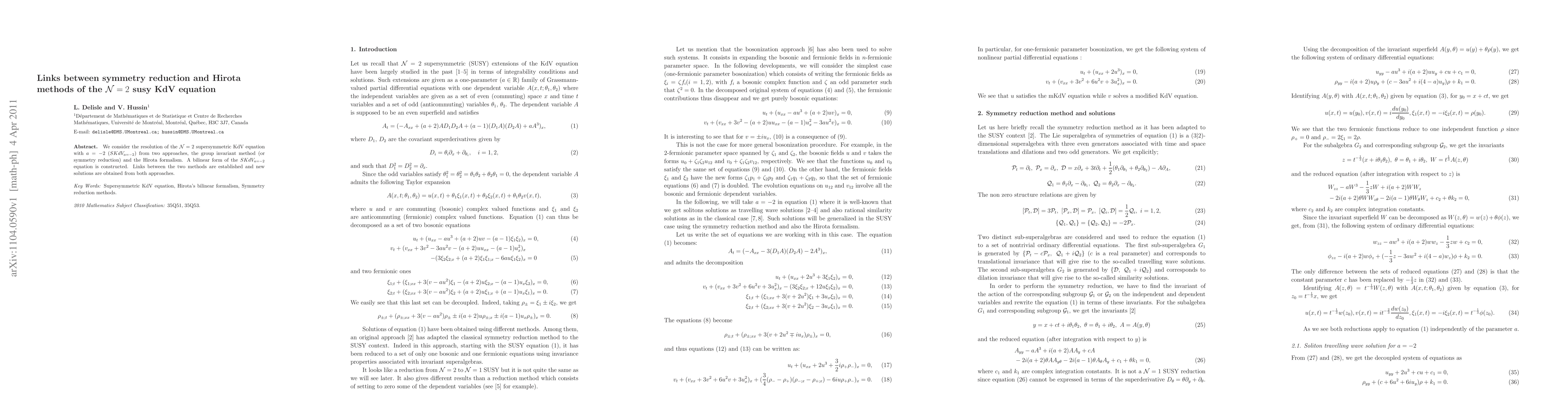 This paper explores the N=2 supersymmetric KdV equation (SKdV_{a=-2}) using both symmetry reduction and Hirota's method, establishing connections between the two approaches and deriving new solutions from each.