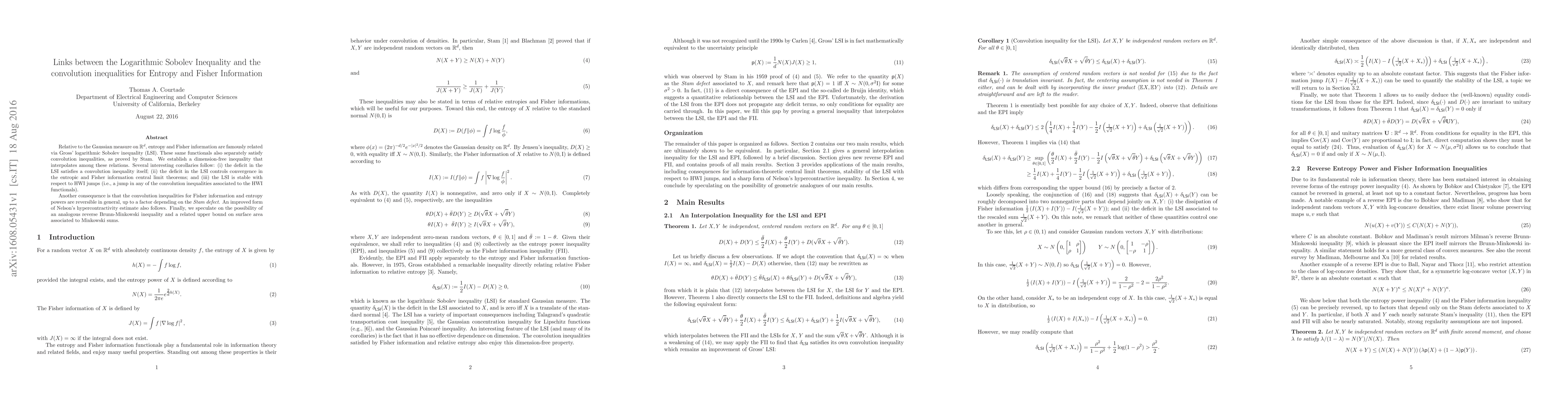 Relative to the Gaussian measure on $\mathbb{R}^d$, entropy and Fisher information are famously related via Gross' logarithmic Sobolev inequality (LSI). These same functionals also separately satisfy convolution inequalities, as proved by Stam. We establish a dimension-free inequality that interpolates among these relations. Several interesting corollaries follow: (i) the deficit in the LSI satisfies a convolution inequality itself; (ii) the deficit in the LSI controls convergence in the entropic and Fisher information central limit theorems; and (iii) the LSI is stable with respect to HWI jumps (i.e., a jump in any of the convolution inequalities associated to the HWI functionals). Another consequence is that the convolution inequalities for Fisher information and entropy powers are reversible in general, up to a factor depending on the Stam defect. An improved form of Nelson's hypercontractivity estimate also follows. Finally, we speculate on the possibility of an analogous reverse Brunn-Minkowski inequality and a related upper bound on surface area associated to Minkowski sums.