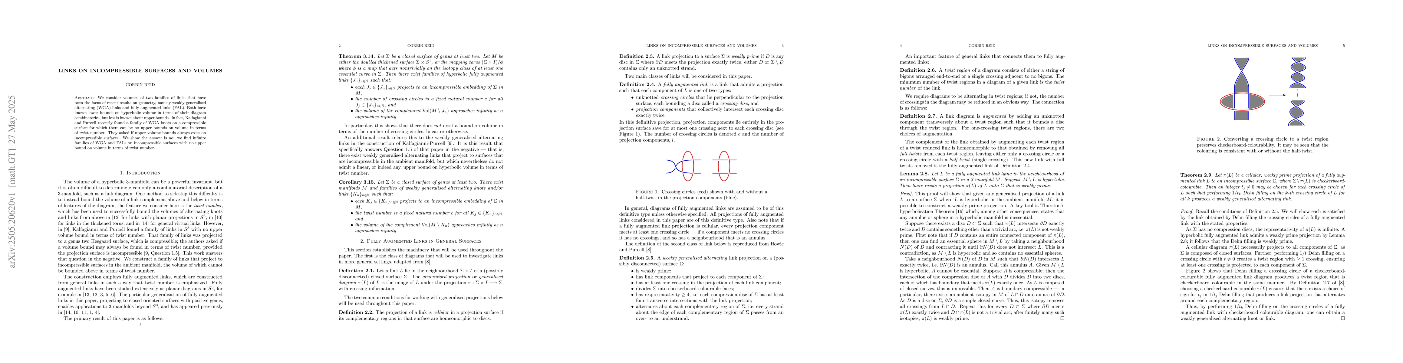 This research identifies infinite families of weakly generalised alternating (WGA) and fully augmented links (FAL) on incompressible surfaces, proving that there can be no upper bounds on volume in terms of twist number, contradicting previous assumptions about volume bounds on incompressible surfaces.